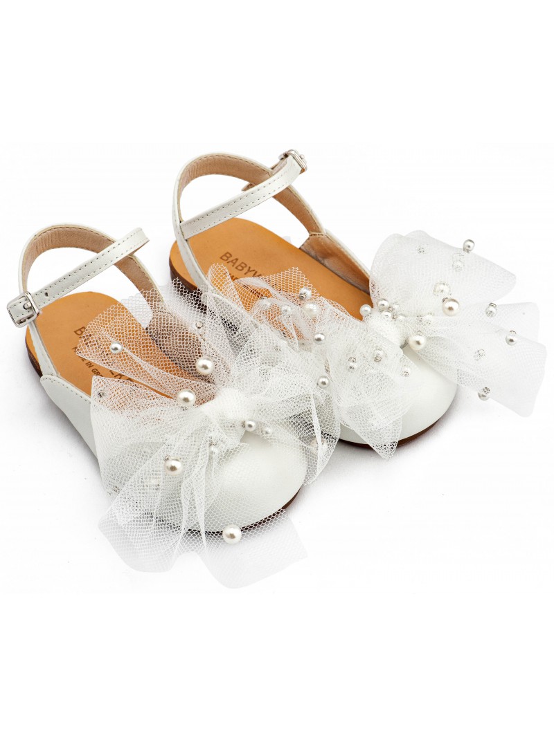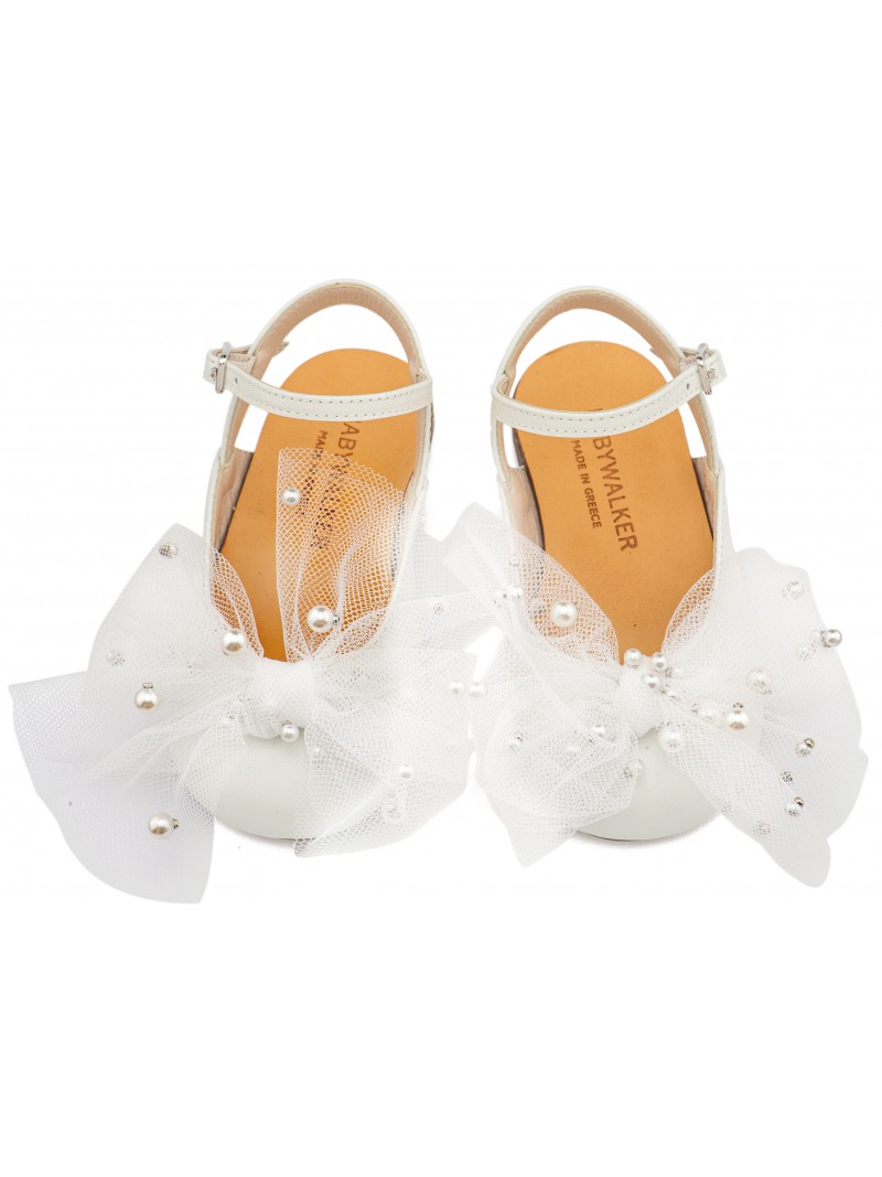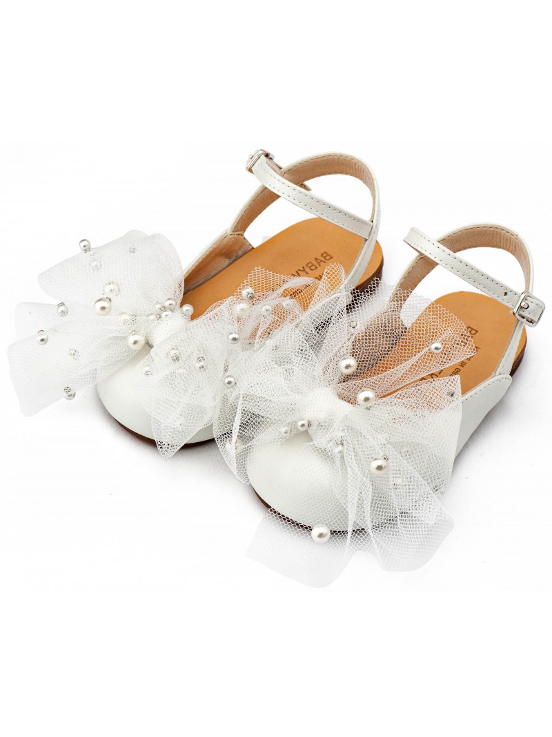 Παπούτσια βάπτισης για κορίτσι γοβάκια Γαλλικά σαμπό μοντέρνα οικονομικά της Babywalker με χειροποίητο φιόγκο από τούλι και πέρλες, σε εκρού απόχρωση.