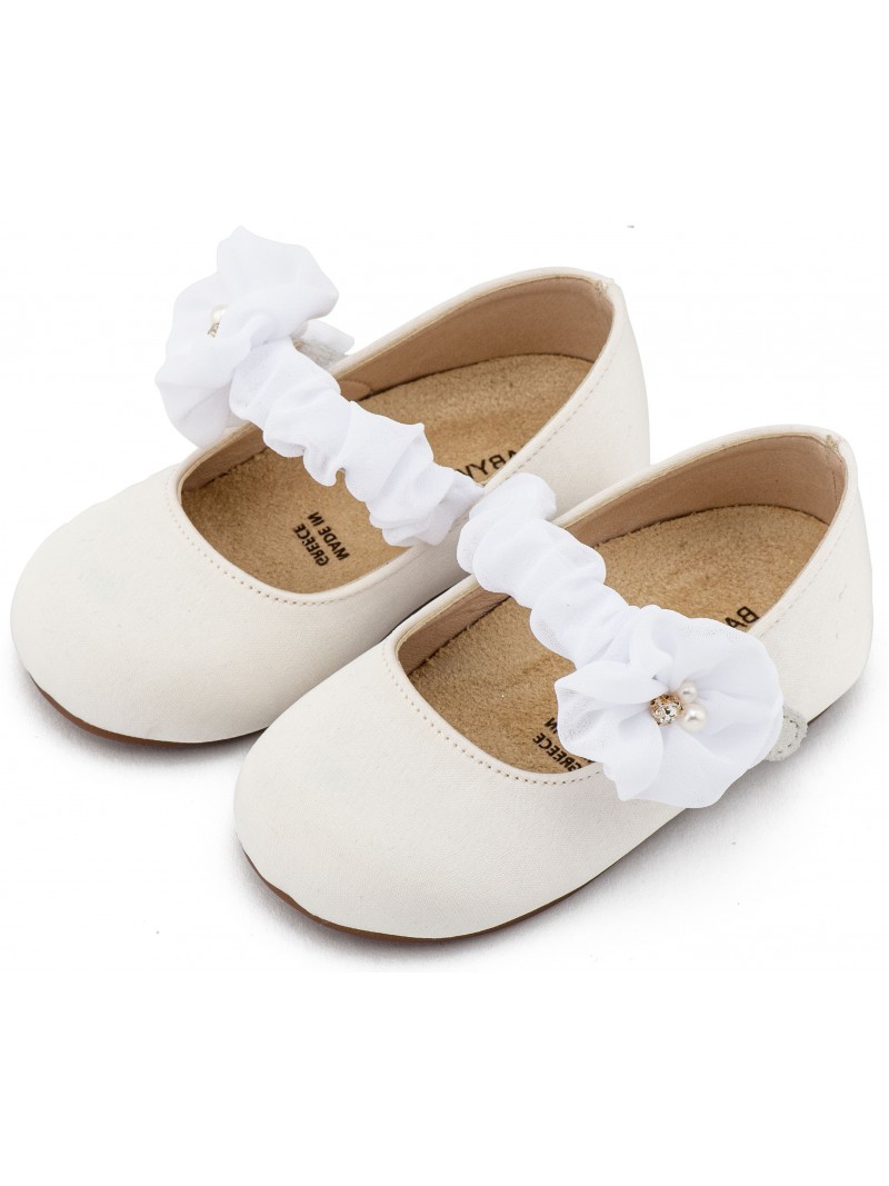 Βαπτιστικά γοβάκια υφασμάτινα μοντέρνα οικονομικά της Babywalker με μονή μπαρέτα χρατς και υφασμάτινο διακοσμητικό, σε λευκή απόχρωση.