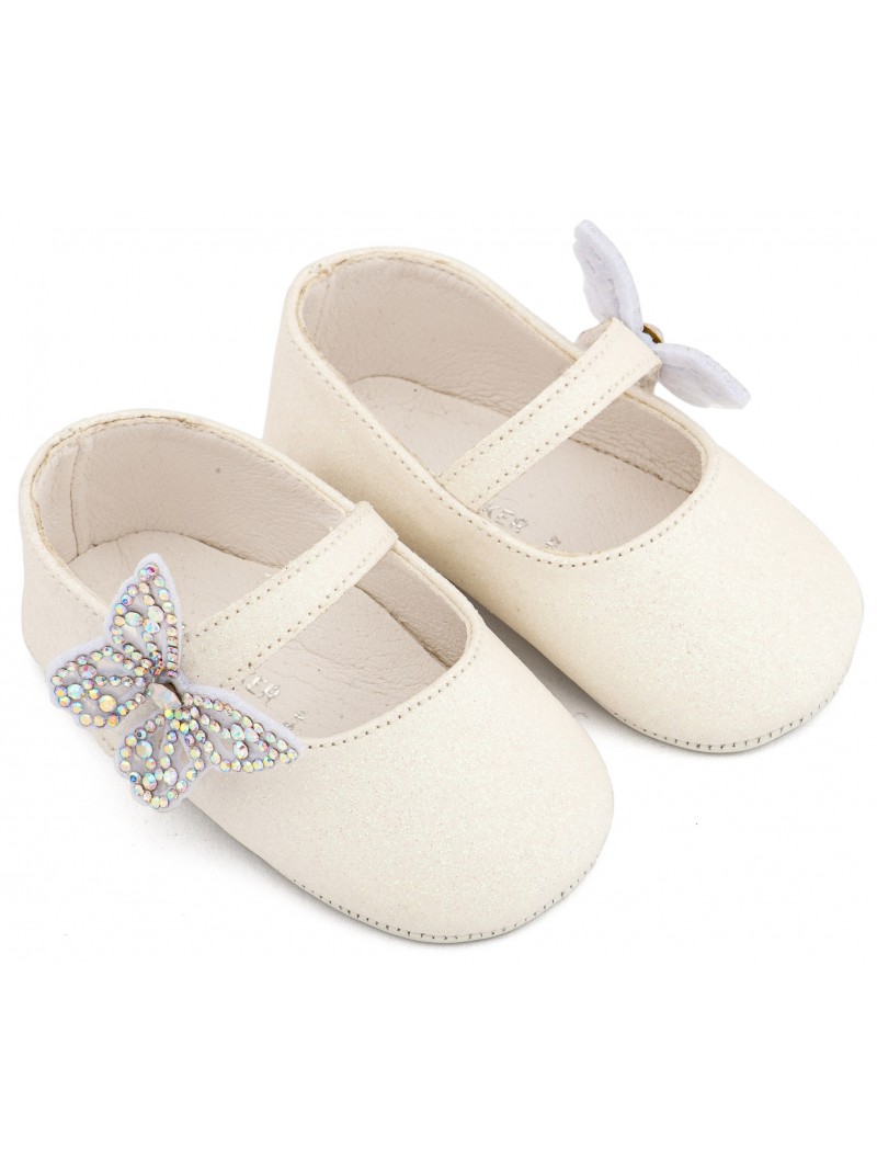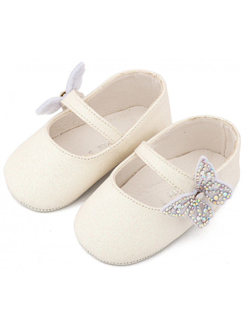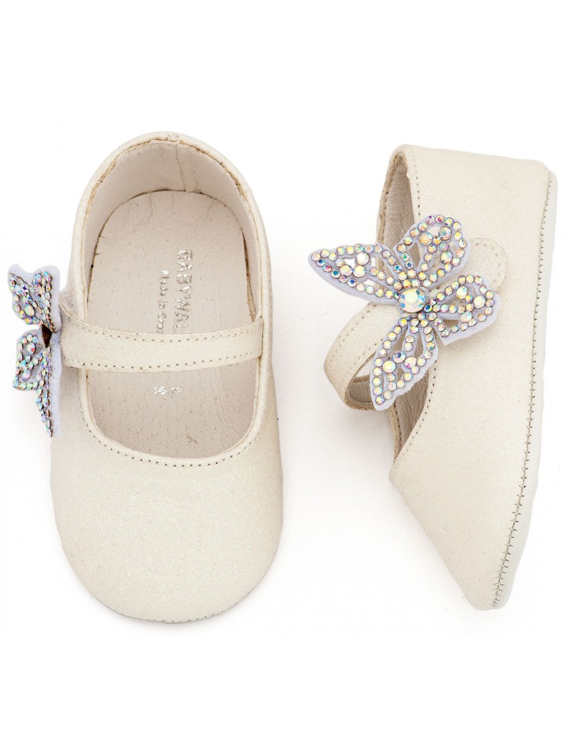 Παπούτσια αγκαλιάς κορίτσι βρεφικά γοβάκια υφασμάτινα οικονομικά λευκά της Babywalker με μονή μπαρέτα χρατς και πεταλούδα strass.