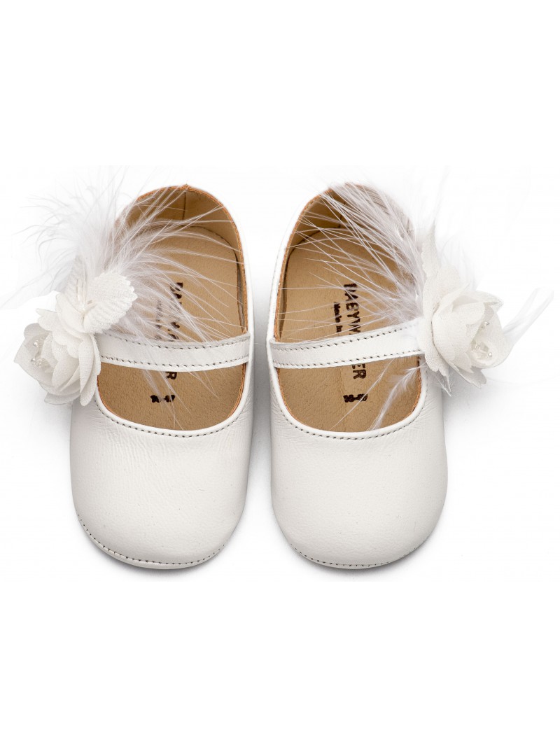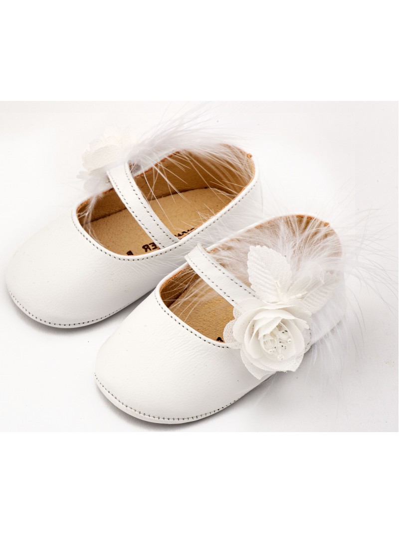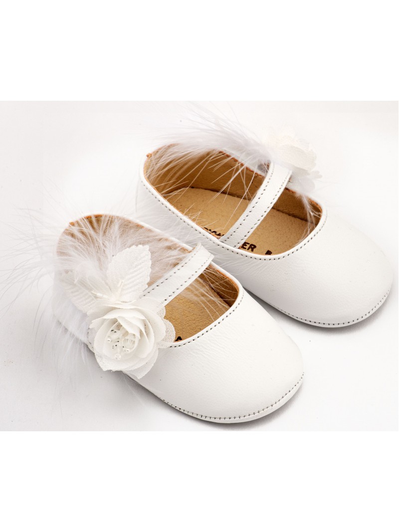 Βρεφικά γοβάκια αγκαλιάς μωρού δερμάτινα οικονομικά λευκά της Babywalker με μονή μπαρέτα, διακοσμημένο με λουλούδι και πούπουλα.