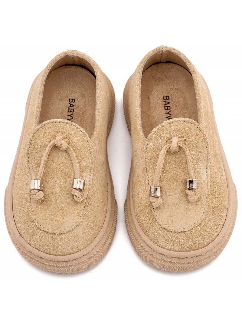 Βαπτιστικά παπούτσια για αγόρι δερμάτινα καστόρ μοκασίνι δετά της Babywalker με φουντάκια και μεταλλική λεπτομέρεια σε μπεζ απόχρωση.