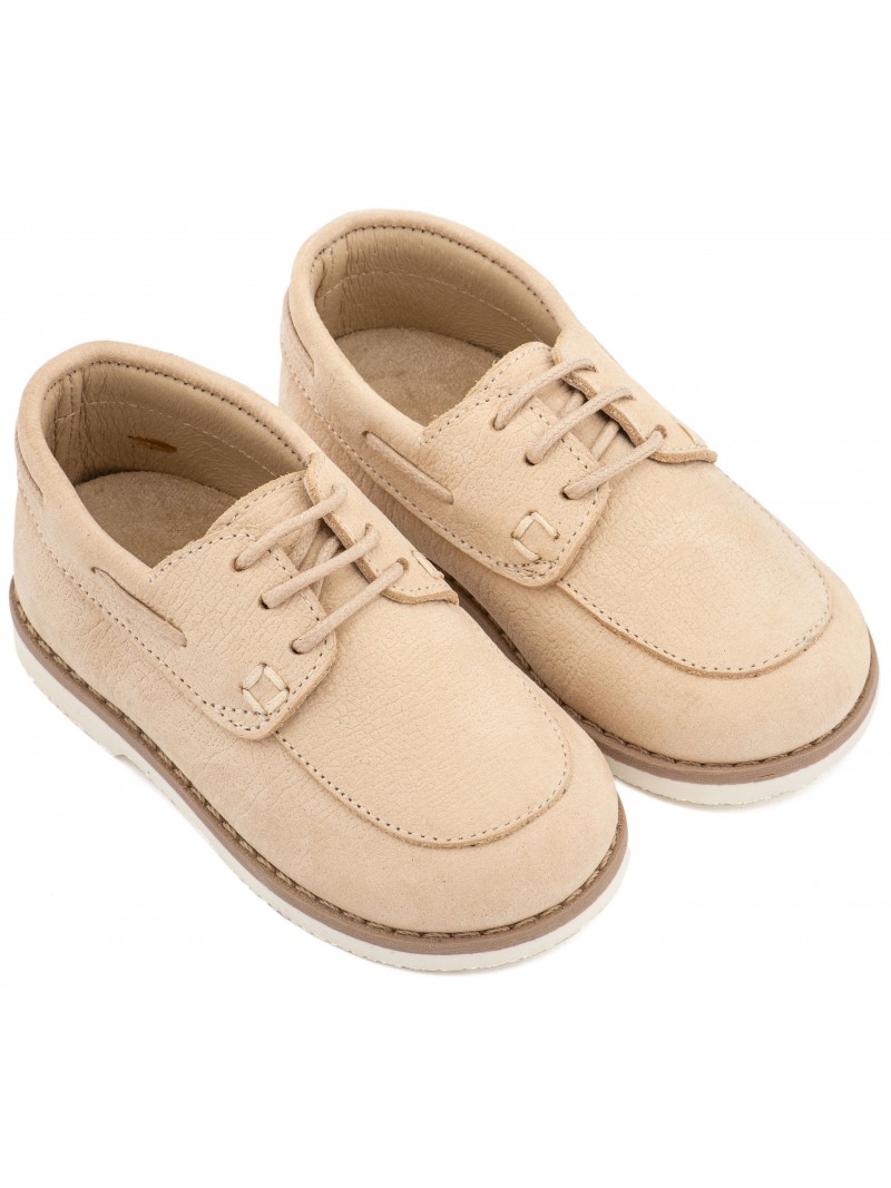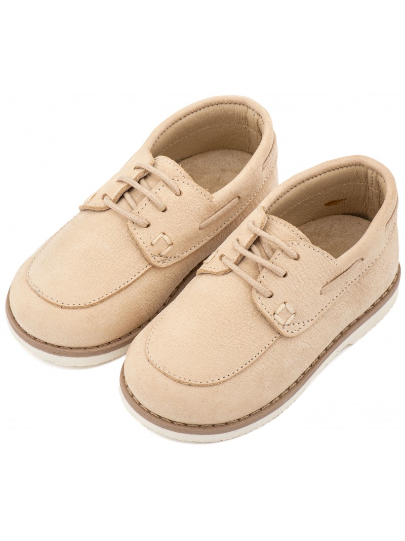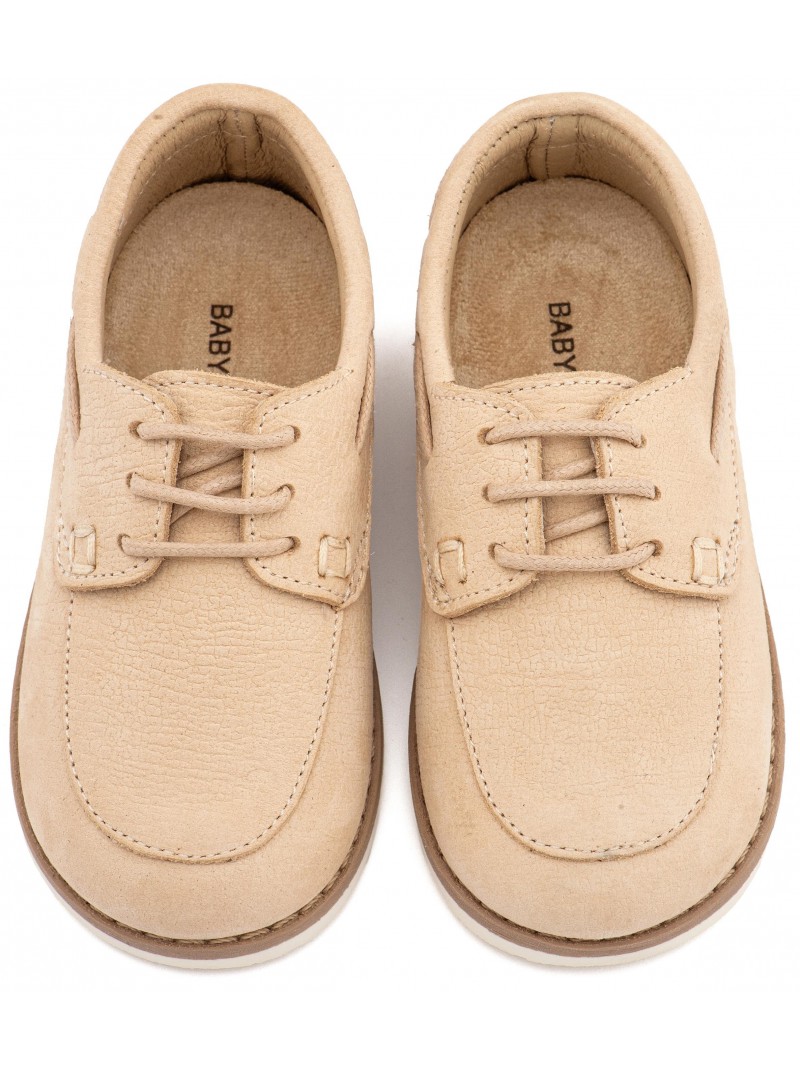 Βαπτιστικά παπούτσια για αγόρι δερμάτινα Ναμπούκ μοκασίνι δετά της Babywalker με κορδόνι σε μπεζ απόχρωση.