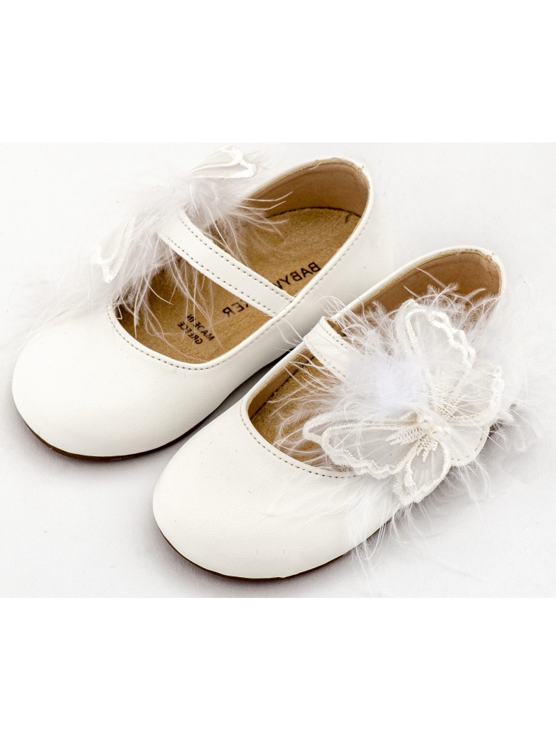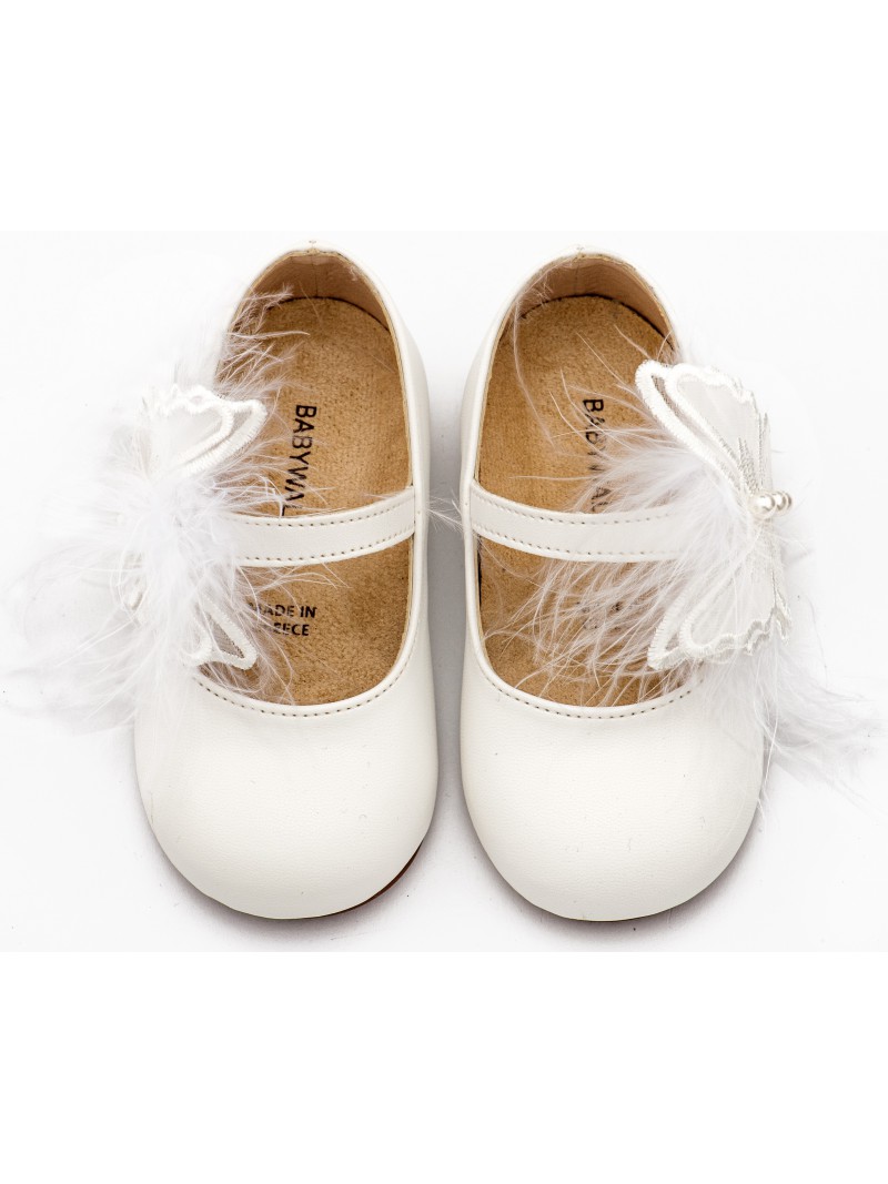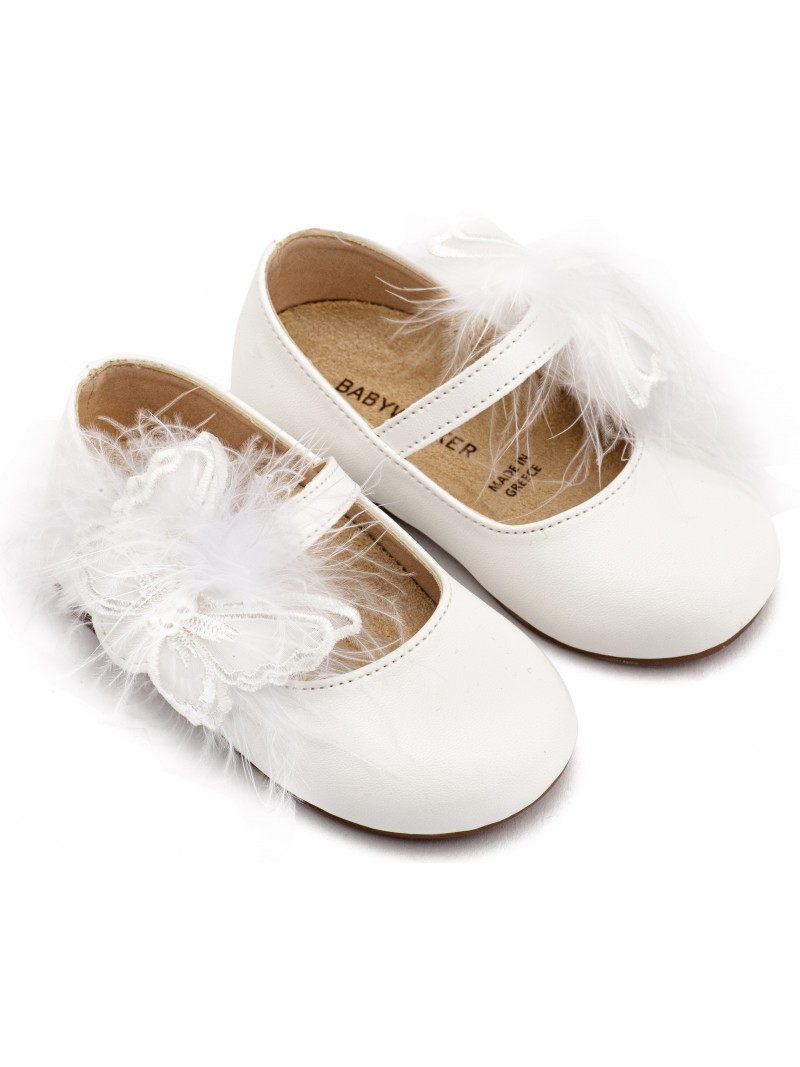 Παπούτσια βάπτισης για κορίτσι δερμάτινα γοβάκια οικονομικά μοντέρνα λευκά της BABYWALKER με μονή μπαρέτα διακοσμημένη με χειροποίητο διακοσμητικό πεταλούδα και πούπουλα .