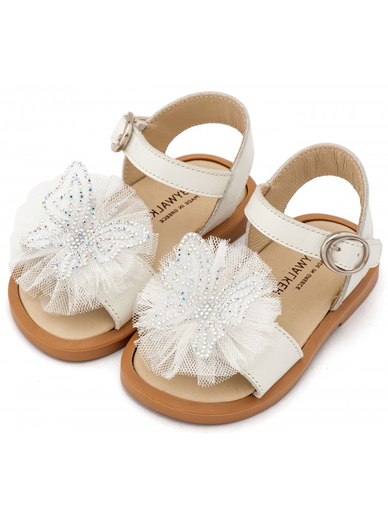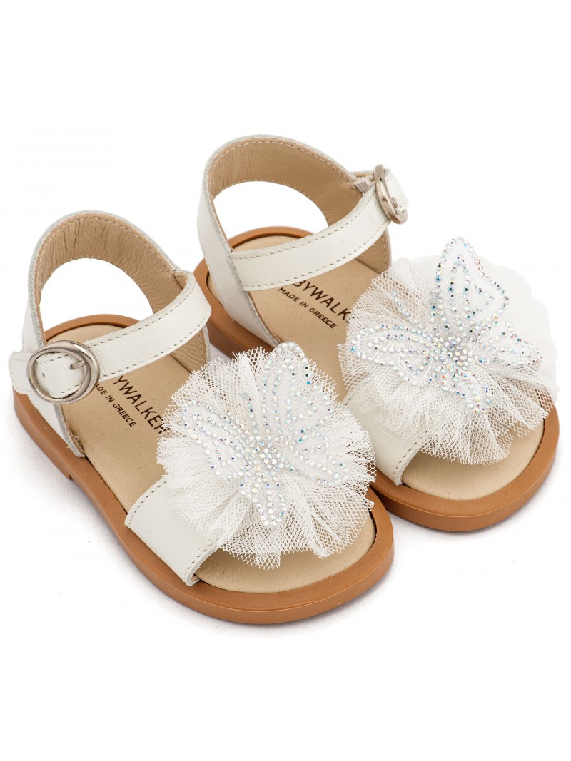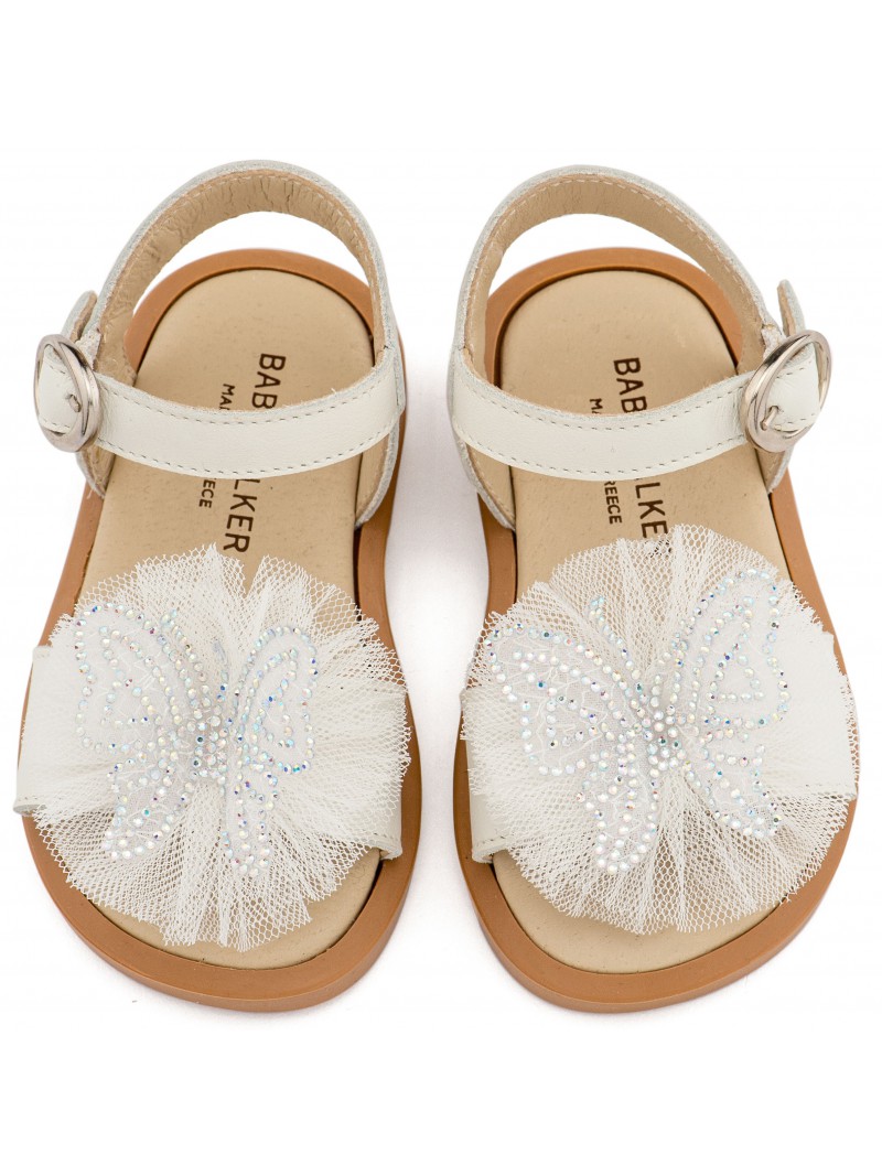 Δερμάτινα πεδιλάκια βάπτισης για κορίτσι οικονομικά της Babywalker διακοσμημένα με χειροποίητη πεταλούδα και τούλι, σε εκρού απόχρωση.