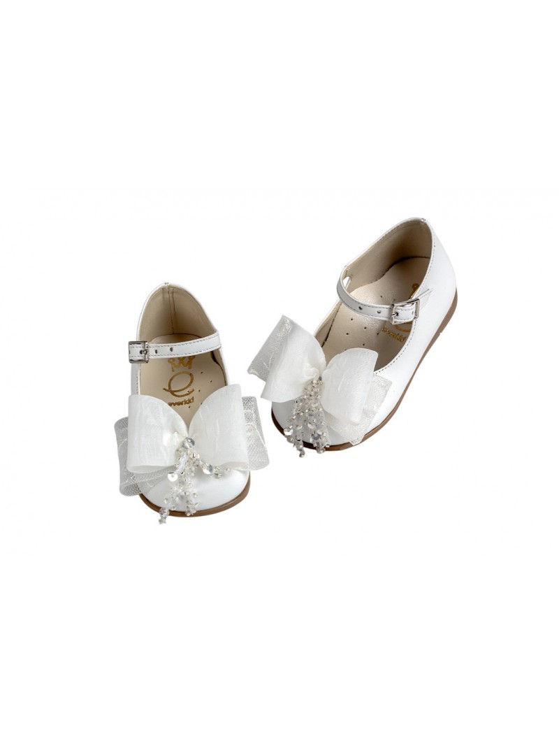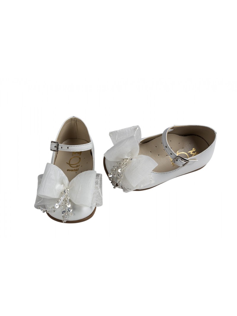 Δερμάτινα γοβάκια βάπτισης οικονομικά σε λευκή απόχρωση της Everkid διακοσμημένα με λευκό φιόγκο.