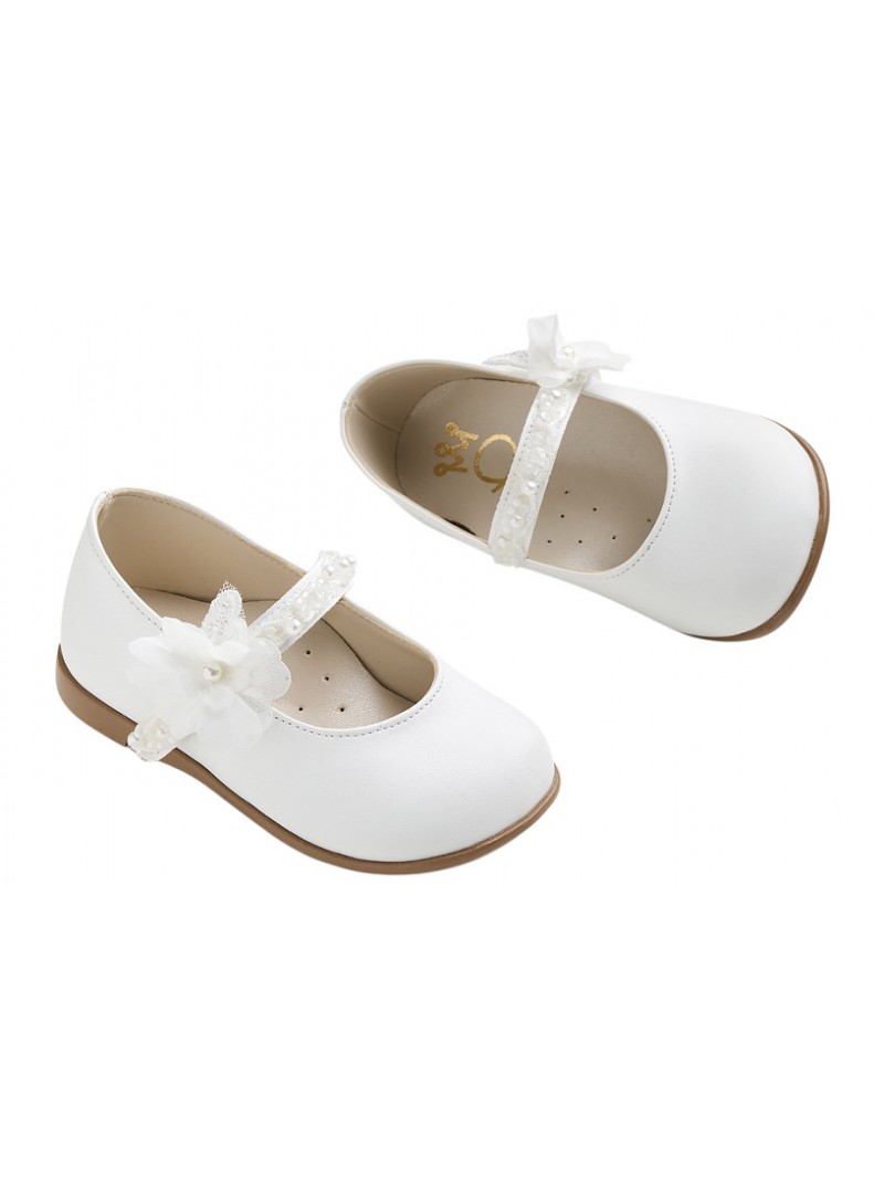 Οικονομικά γοβάκια βάπτισης δερμάτινα σε λευκή απόχρωση της Everkid με πέρλες και λουλούδι στν μπαρέτα.