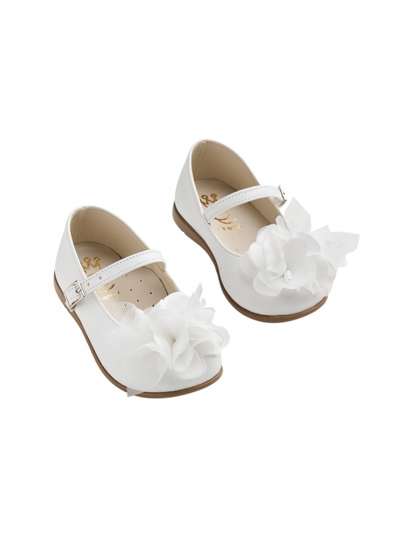 Γοβάκια βάπτισης δερμάτινα ανατομικά οικονομικά σε λευκή απόχρωση της Everkid με χειροποίητο λουλούδι και πέρλες.