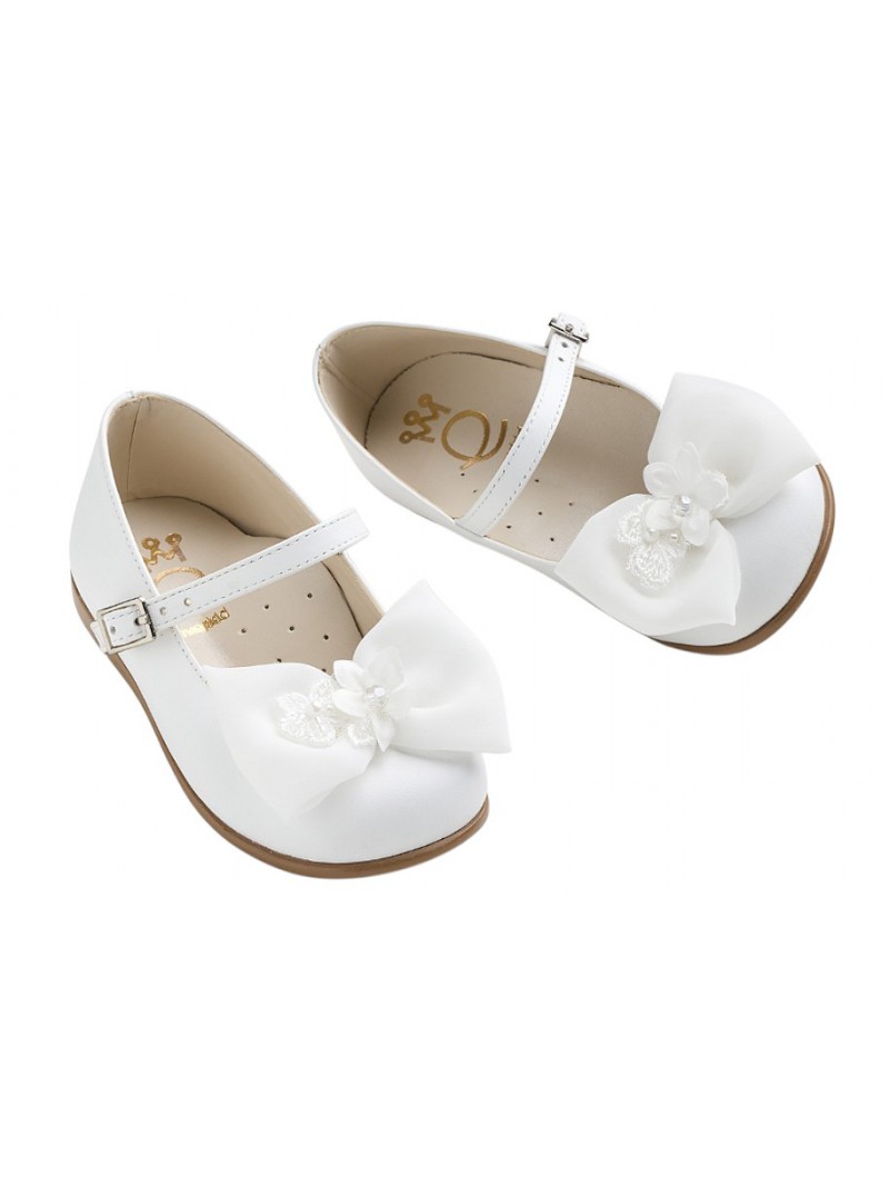 Βαπτιστικά γοβάκια δερμάτινα ανατομικά οικονομικά σε λευκή απόχρωση της Everkid διακοσμημένα με φιόγκο από μουσελίνα.