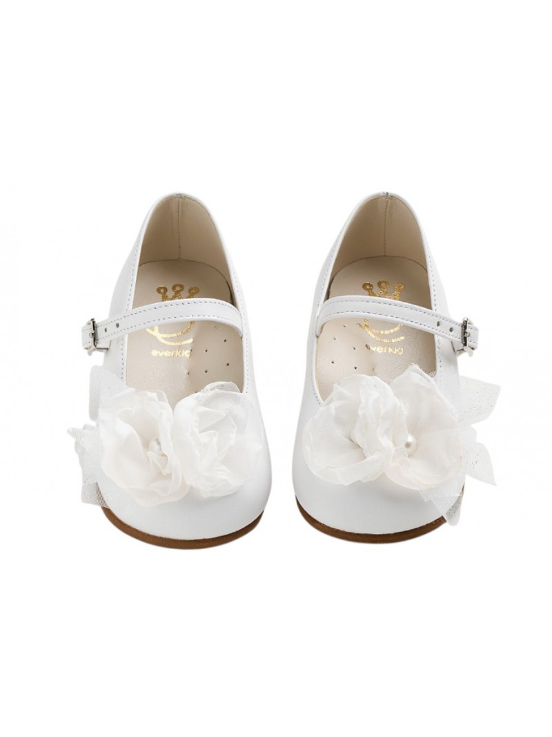 Δερμάτινα βαπτιστικά παπούτσια για κορίτσι γοβάκια οικονομικά ανατομικά λευκά της Everkid με χειροποίητο διακοσμητικό και τούλι.