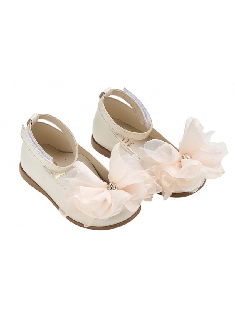 Βαπιστικά γοβάκια δερμάτινα οικονομικά ανατομικά εκρού της Everkid με χειροποίητο διακοσμητικό από μουσελίνα και strass.