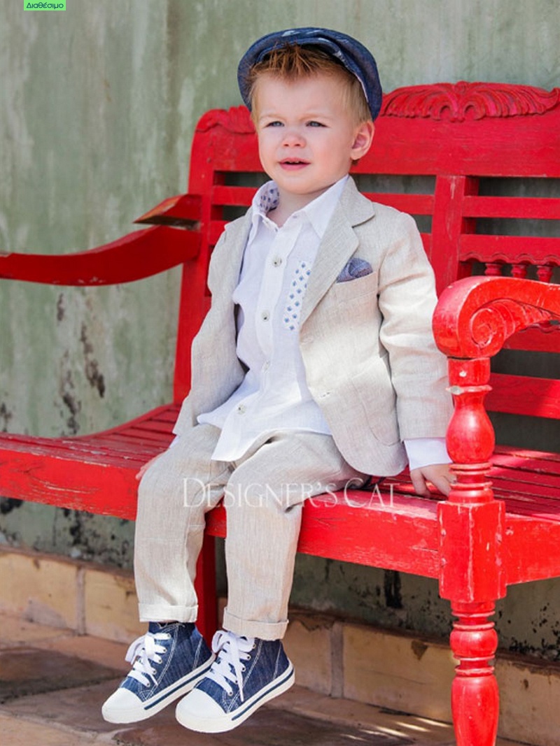 Εξαιρετικό κουστουμάκι βάπτισης Designer's Cat για το αγοράκι σας σε φυσικές αποχρώσεις, λινό, αποτελούμενο από παντελόνι με μοντέρνες τιράντες, σακάκι με μαντηλάκι στο πέτο και πουκάμισο !!Αποτελεί μία πανέμορφη επιλογή για το μικρό σας αγοράκι !!