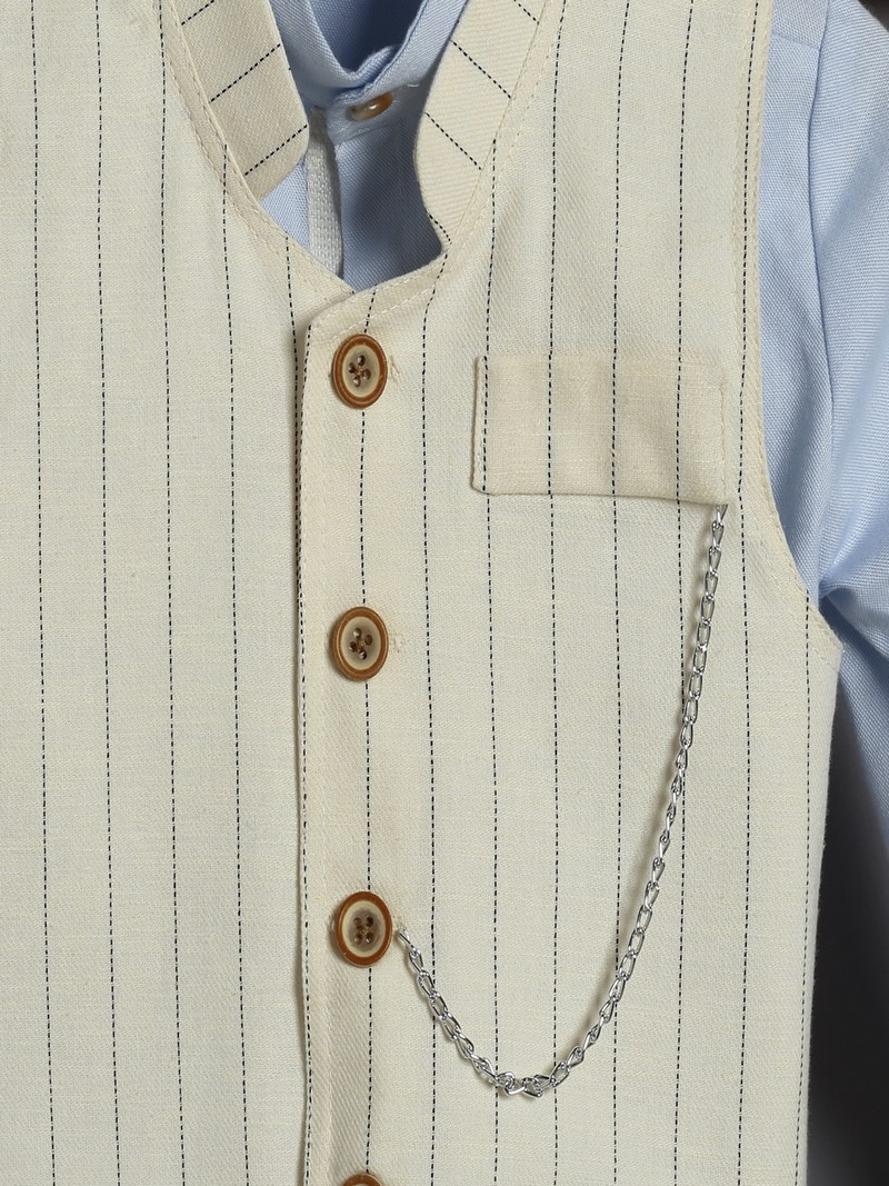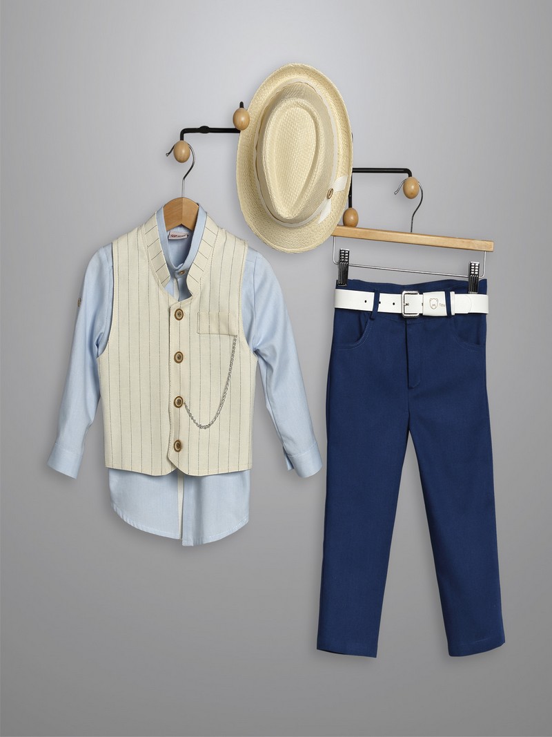 Οικονομικό κουστουμάκι βάπτισης New Life ολοκληρωμένο σετ αποτελούμενο από ραφ βαμβακερή καπαρντίνα παντελόνι με ζώνη, σιέλ βαμβακερό πουκάμισο, εκρού ριγέ γιλέκο και ψάθινο καπελάκι στυλ καβουράκι.Το βαπτιστικό κουστουμάκι New Life περιλαμβάνει: