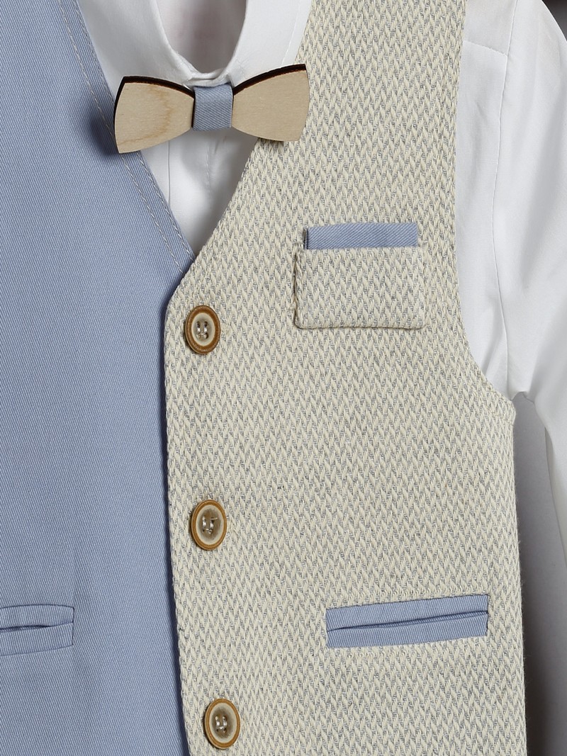 Βαπτιστικό κουστουμάκι βάπτισης New Life ολοκληρωμένο σετ αποτελούμενο από σιέλ βαμβακερή καπαρντίνα παντελόνι με τιράντες, λευκό βαμβακερό πουκάμισο, σιέλ/μπεζ ψαροκκόκαλο γιλέκο και ψάθινο καπελάκι στυλ καβουράκι.Το βαπτιστικό κουστουμάκι New Life περιλαμβάνει: