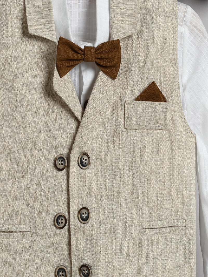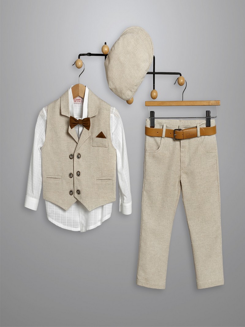 Κουστουμάκι βάπτισης New Life πλήρες σετ αποτελούμενο από μπεζ λινό ψάθα παντελόνι με ζώνη, λευκό βαμβακερό πουκάμισο, μπεζ λινό ψάθα γιλέκο και καπελάκι στυλ τραγιάσκα.Το βαπτιστικό κουστουμάκι New Life περιλαμβάνει: