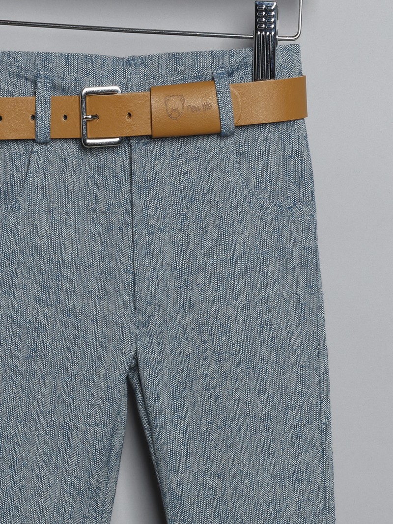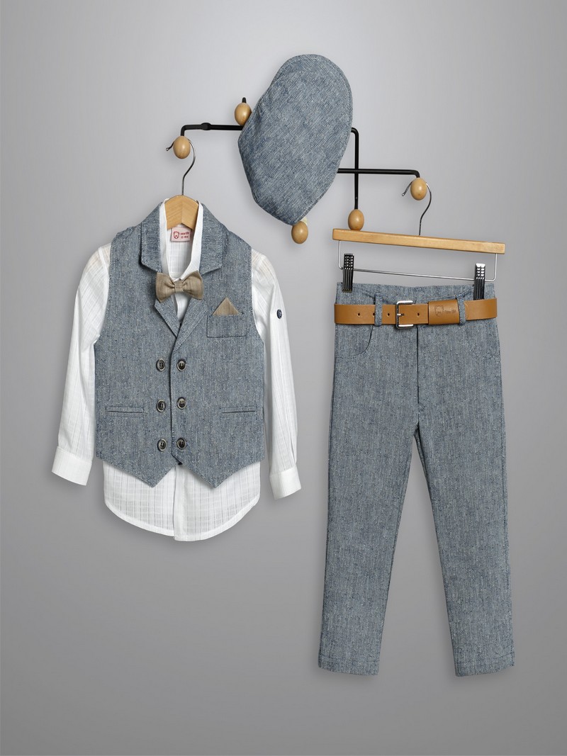 Κουστουμάκι βάπτισης New Life μονέρνο σετ αποτελούμενο από μπλε λινό ψάθα παντελόνι με ζώνη, λευκό βαμβακερό πουκάμισο, μπλε λινό ψάθα γιλέκο και καπελάκι στυλ τραγιάσκα.Το βαπτιστικό κουστουμάκι New Life περιλαμβάνει: