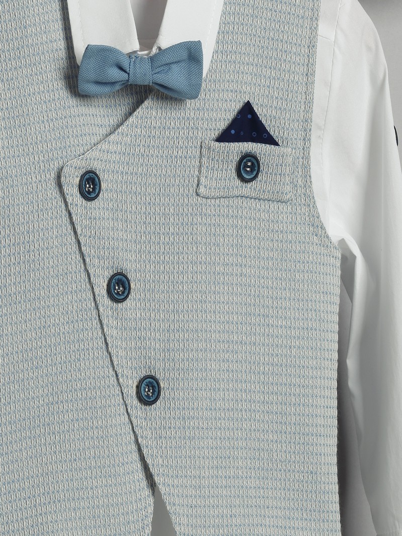 Κουστουμάκι βάπτισης New Life οικονομικό σετ αποτελούμενο από σιέλ βαμβακερή καπαρντίνα παντελόνι με ζώνη, λευκό βαμβακερό πουκάμισο, σιέλ ψάθα γιλέκο και καπελάκι στυλ καβουράκι.Το βαπτιστικό κουστουμάκι New Life περιλαμβάνει: