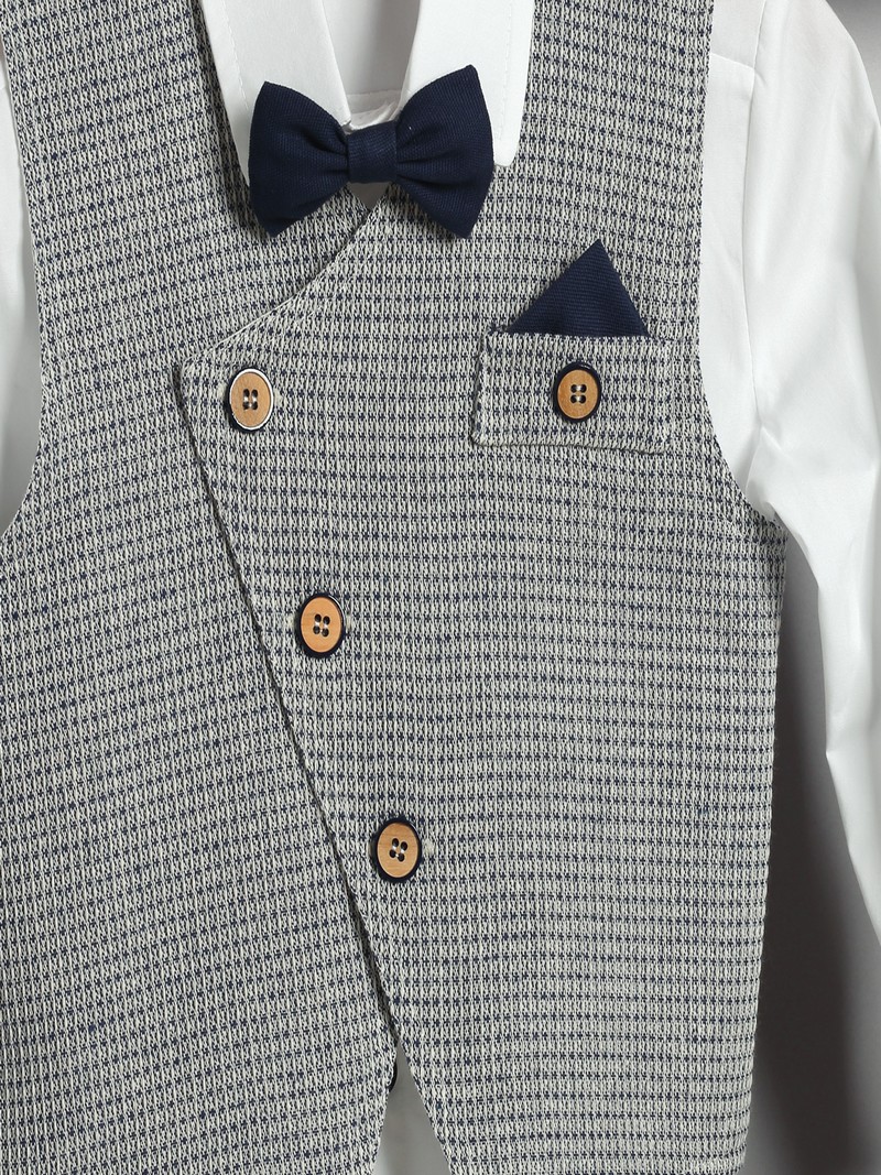 Κουστουμάκι βάπτισης New Life οικονομικό σετ αποτελούμενο από μπλε βαμβακερή καπαρντίνα παντελόνι με ζώνη, λευκό βαμβακερό πουκάμισο, μπλε ψάθα γιλέκο και καπελάκι στυλ καβουράκι.Το βαπτιστικό κουστουμάκι New Life περιλαμβάνει: