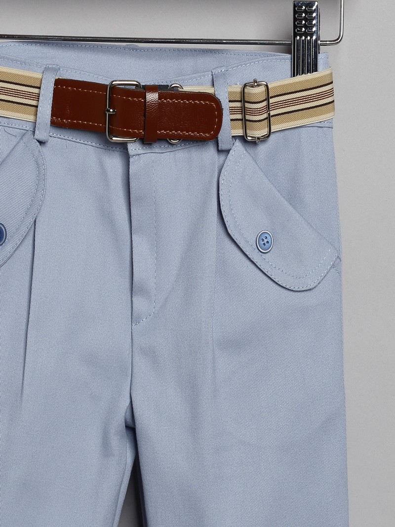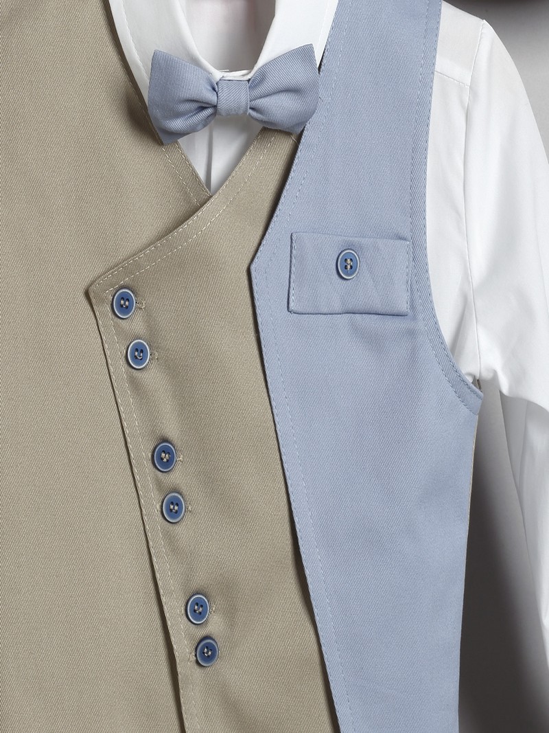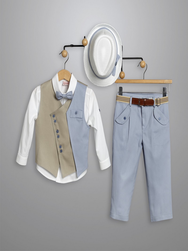 Κουστουμάκι βάπτισης New Life ολοκληρωμένο σετ αποτελούμενο από σιέλ βαμβακερή καπαρντίνα παντελόνι με ζώνη, λευκό βαμβακερό πουκάμισο, μπεζ/σιέλ γιλέκο και καπελάκι στυλ καβουράκι.Το βαπτιστικό κουστουμάκι New Life περιλαμβάνει: