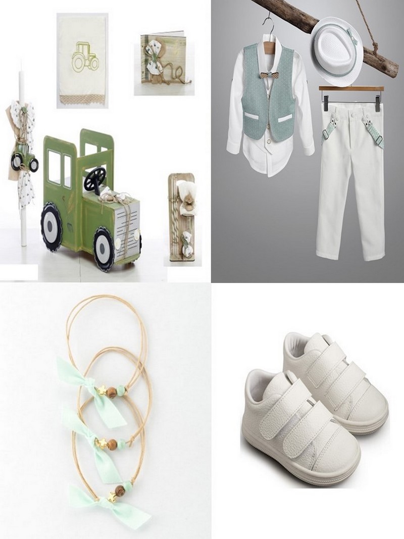 Ολοκληρωμένο πακέτο βάπτισης με θέμα τον "Αγρότη Σε Τρακτέρ". Αποτελείται από το κουστουμάκι της New Life με βαμβακερό λευκό παντελόνι, τιράντες, εκρού βαμβακερό πουκάμισο, γιλέκο, παπιγιόν και καπελάκι, υπέροχο σετ βάπτισης Bellissimo με ξύλινο κουτί σχήματος αγροτικού μηχανήματος, λαμπάδα, λαδοσέτ (μπουκαλάκι και σαπουνάκι), πλήρης σετ λαδόπανα και 3 κεράκια για την κολυμπήθρα, όλα διακοσμημένα ασορτί.