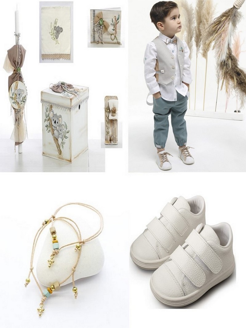 Ολοκληρωμένο πακέτο βάπτισης με θέμα "Κοάλα"σε όμορφες αποχρώσεις και προϊόντα των επώνυμων εταιριών Mi Chiamo, Bellissimo και Babywalker. Αποτελείται από κουστουμάκι με μοντέρνο παντελόνι, τιράντες, λευκό πουκάμισο, γιλέκο, παπιγιόν και καπελάκι, σετ βάπτισης με ξύλινο κουτί που μπορεί να χρησιμοποιηθεί και σαν αποθηκευτικός χώρος στο παιδικό δωμάτιο διακοσμημένο με το αγαπημένο μας ζωάκι στο φυσικό του περιβάλλον, λαμπάδα, λαδοσέτ (μπουκαλάκι και σαπουνάκι) και 3 κεράκια για την κολυμπήθρα.