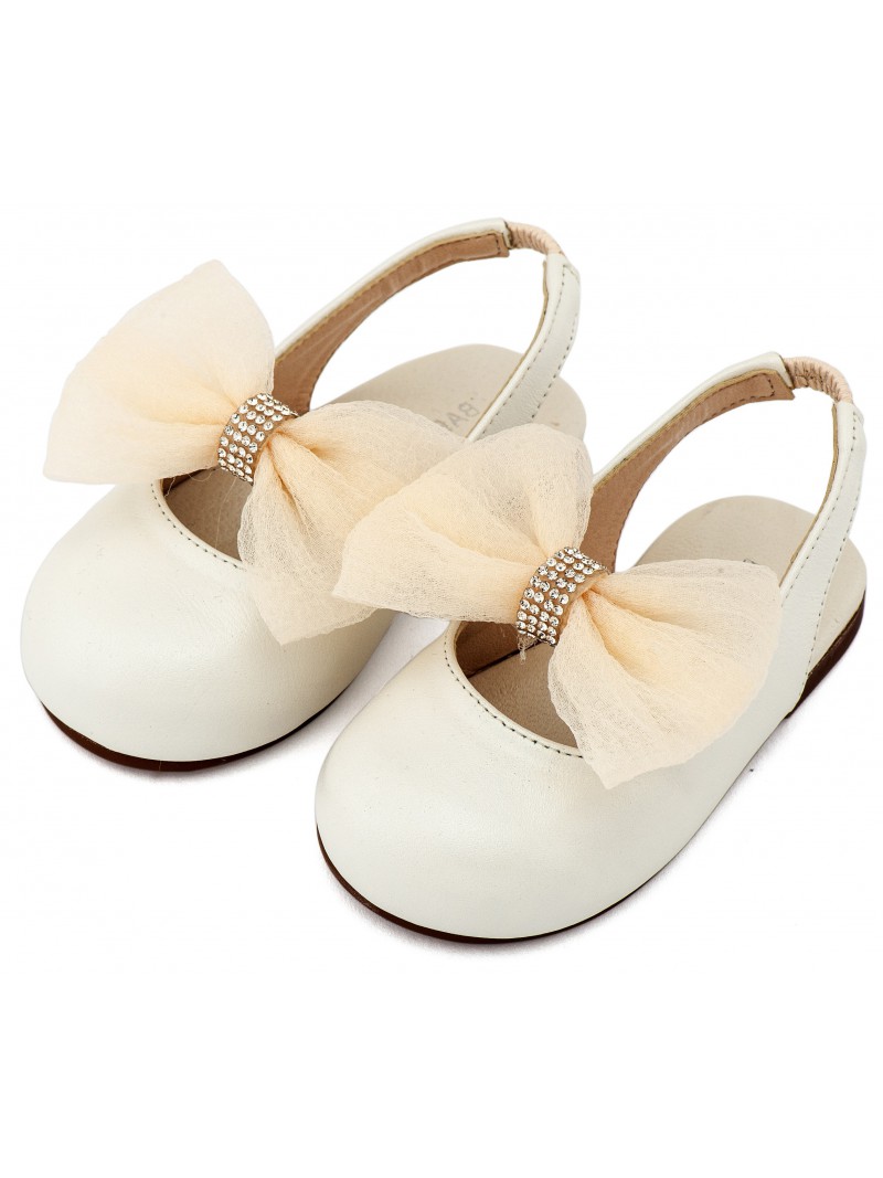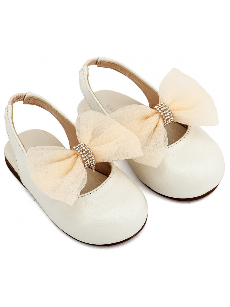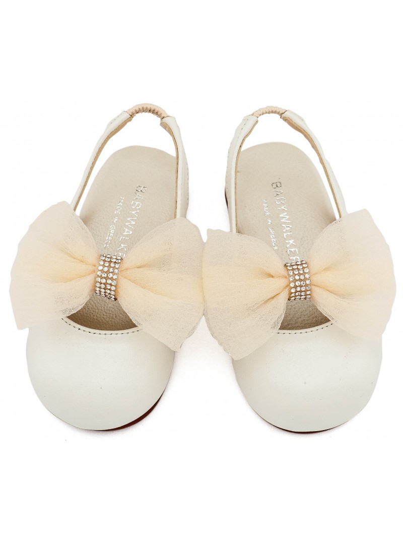 Παπούτσια βάπτισης για κορίτσι γοβάκια Γαλλικά σαμπό μοντέρνα οικονομικά της Babywalker διακοσμημένα με φιόγκο οργάντζας και strass, σε εκρού απόχρωση.