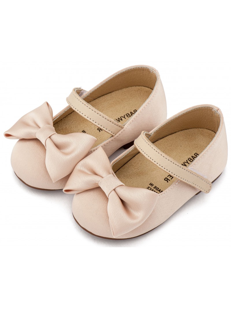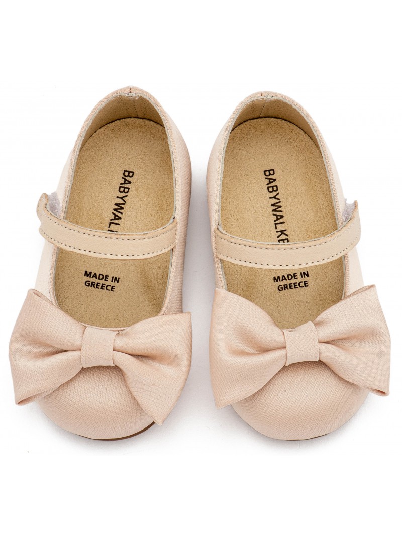 Παπούτσια βάπτισης κορίτσι γοβάκια μοντέρνα οικονομικά υφασμάτινα της Babywalker με μονή μπαρέτα χρατς και sattin χειροποίητο φιόγκο, σε μπεζ απόχρωση.