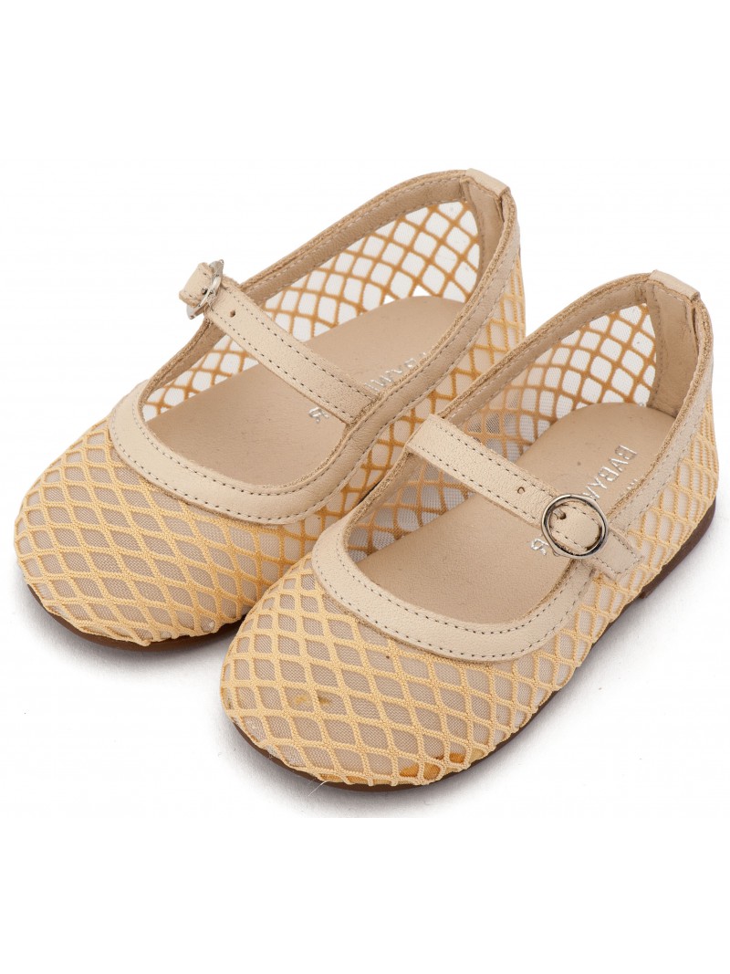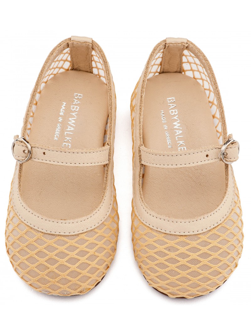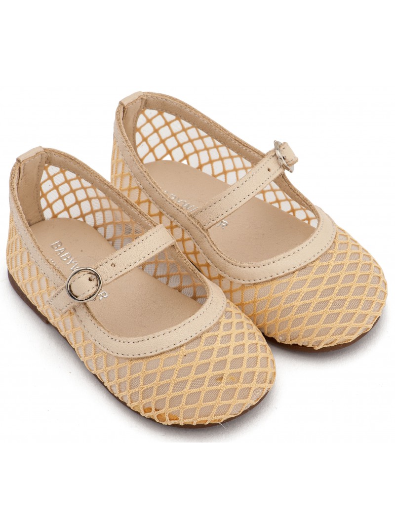 Παπούτσια βάπτισης κορίτσι γοβάκια μοντέρνα οικονομικά της Babywalker με μονή μπαρέτα, από ύφασμα φιλντιρέ δίχτυ, με δερμάτινες λεπτομέρειες, σε μπεζ απόχρωση.