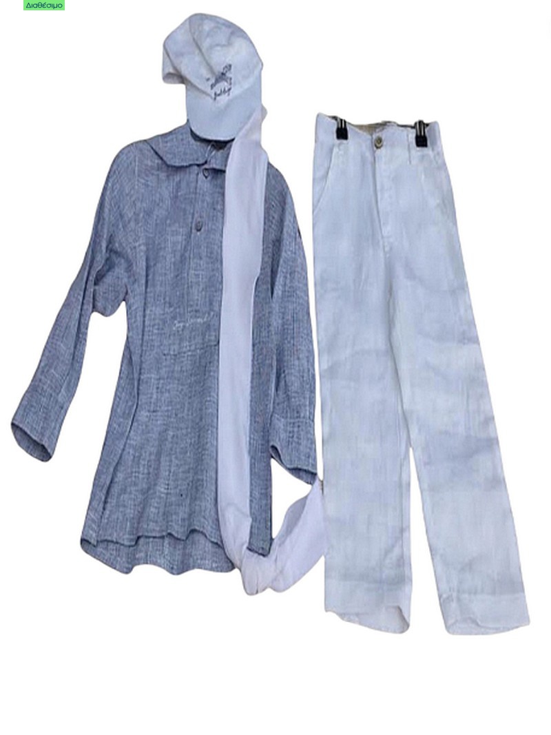 Boem κουστουμάκι βάπτισης από την Guy Laroche λινό 100% εξαιρετικής αισθητικής και ποιότητας σε όμορφες καλοκαιρινές αποχρώσεις, αποτελούμενο από λευκό παντελόνι, γκρι πουκαμίσα με λογότυπο κεντημένο της γνωστής εταιρίας και λευκό φουλάρι .Το σετ ολοκληρώνεται από λευκό καπελάκι στην ίδια τιμή .