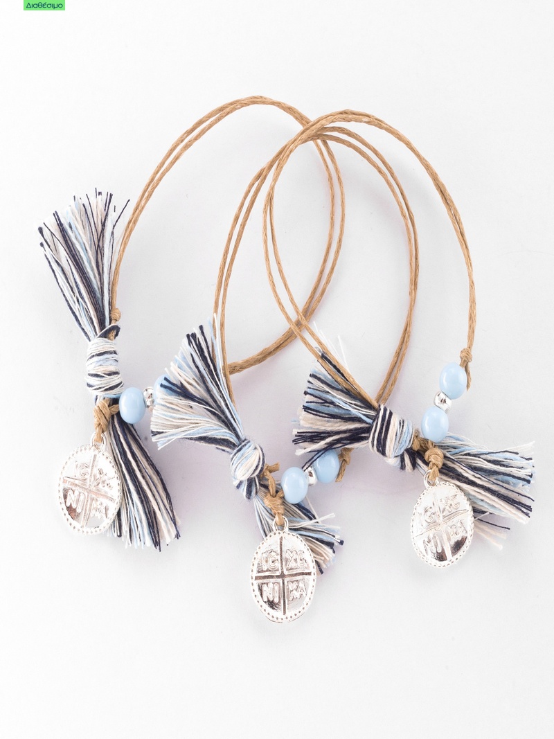 Μοντέρνα μαρτυρικά βάπτισης για αγόρι, βραχιολάκι από φυσικό σπάγκο διακοσμημένο με επάργυρο Κωνσταντινάτο, διακοσμημένο με λευκές και επάργυρες χάνδρες και μπλε/σιέλ σπάγκο !!