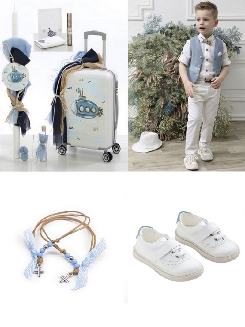 Βαπτιστικό πακέτο με θέμα "Υποβρύχιο" ολοκληρωμένο σετ σε χαρούμενες αποχρώσεις που θα ενθουσιάσουν εσάς και τους καλεσμένους σας, συνδυασμός προϊόντων των επώνυμων εταιριών Mi Chiamo, Bellissimo και Everkid. Αποτελείται από μοντέρνο κουστουμάκι με παντελόνι, ζώνη, λευκό πουκάμισο, υπέροχο γιλέκο, παπιγιόν και καπελάκι, σετ βάπτισης με τροχήλατη βαλίτσα για εύκολες μετακινήσεις, λαμπάδα, σετ λαδιού (μπουκαλάκι και σαπουνάκι) και 3 κεράκια για την κολυμπήθρα. Σας προτείνουμε και τα ανάλογα μαρτυρικά (επιλέξτε πριν την προσθήκη στο καλάθι).