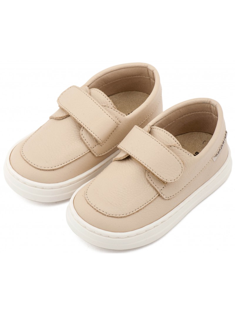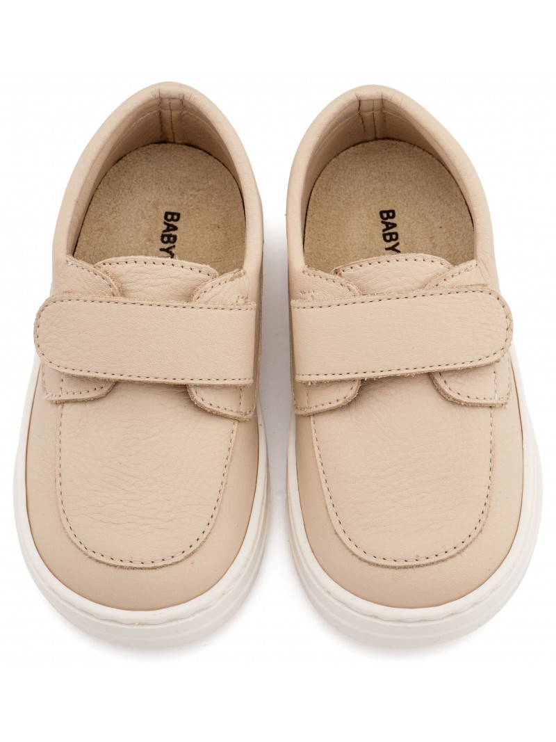 Βαπτιστικά παπούτσια για αγόρι δερμάτινα μοκασίνι της Babywalker με εύκολο κλείστρο χρατς σε μπεζ απόχρωση.