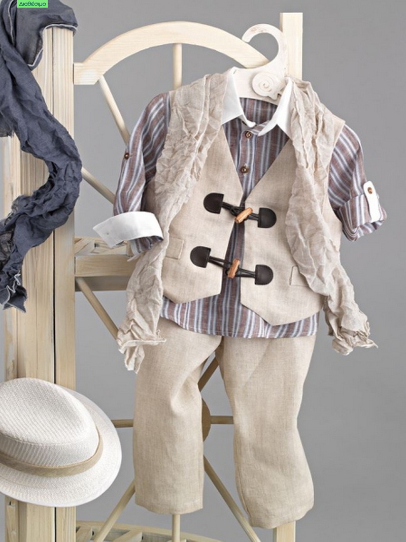 Βαπτιστικό κουστουμάκι από την Lollipop σε απαλές γήινες αποχρώσεις αποτελούμενο από λινό παντελόνι, λινό πουκάμισο, εξαιρετικό γιλέκο, φουλάρι και ασορτί καπελάκι !!Το κουστουμάκι βάπτισης Lollipop περιλαμβάνει: