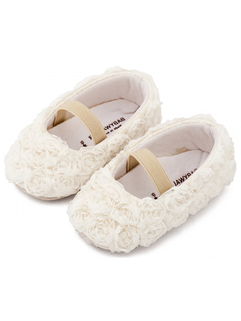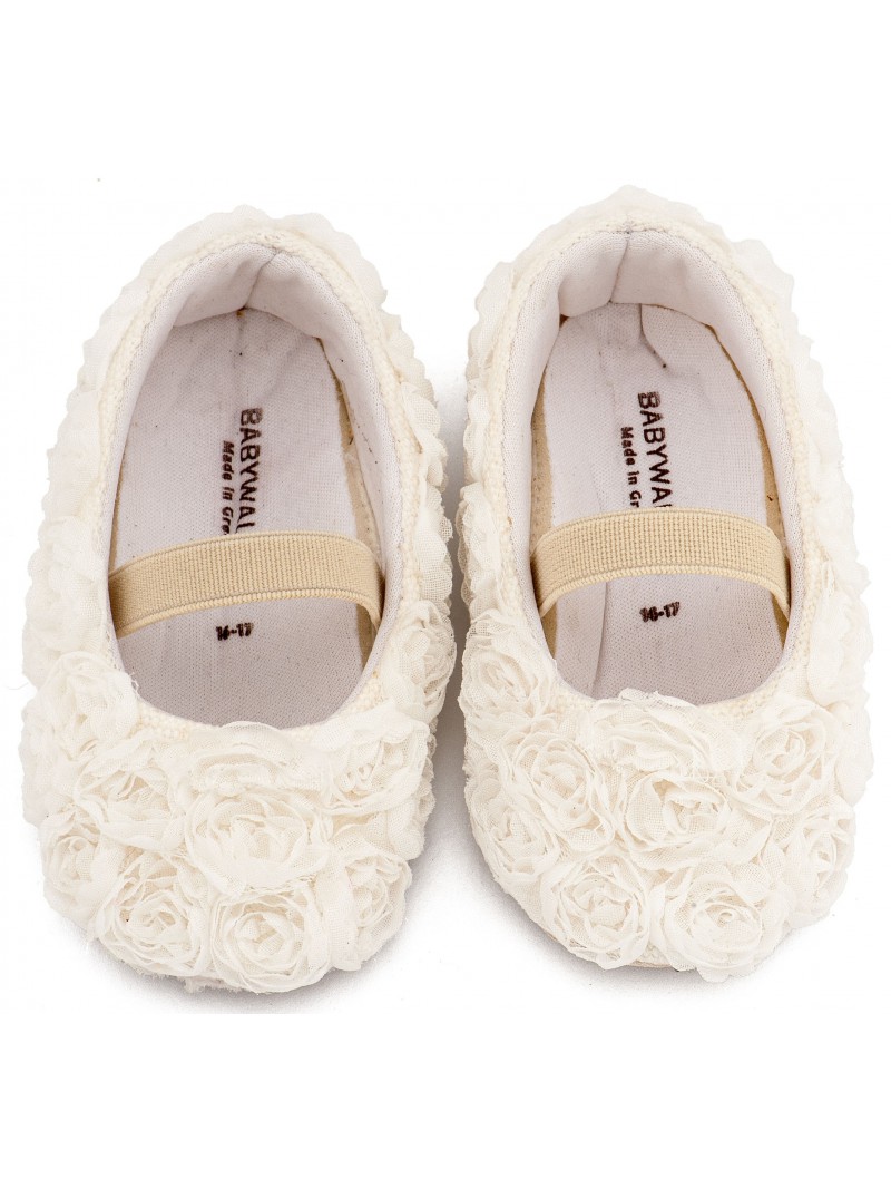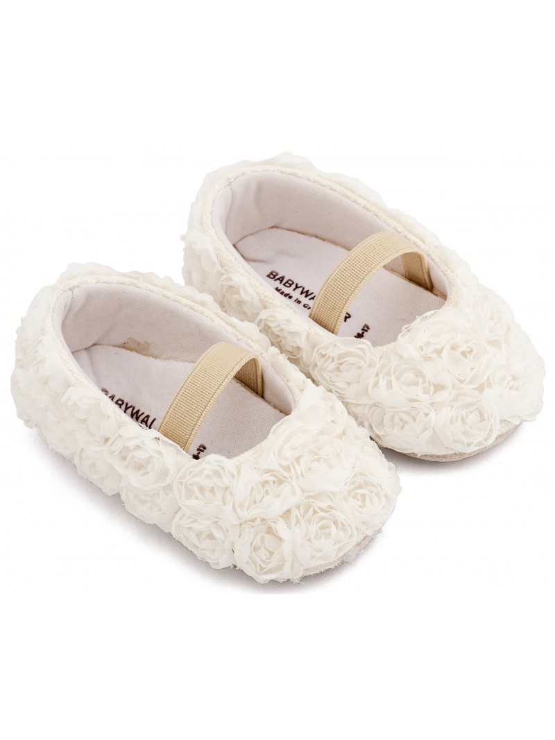 Μπαλαρίνες αγκαλιάς βρεφικές υφασμάτινες οικονομικές λευκές της Babywalker διακοσμημένες με chiffon λουλούδια.