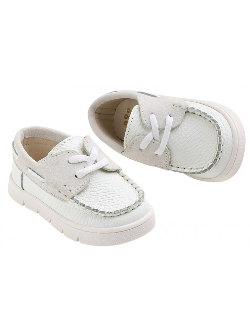 Παπούτσια βάπτισης για αγόρι μοκασίνι από λευκό δέρμα και λευκό καστόρ δέρμα της Everkid σε μοντέρνα γραμμή .