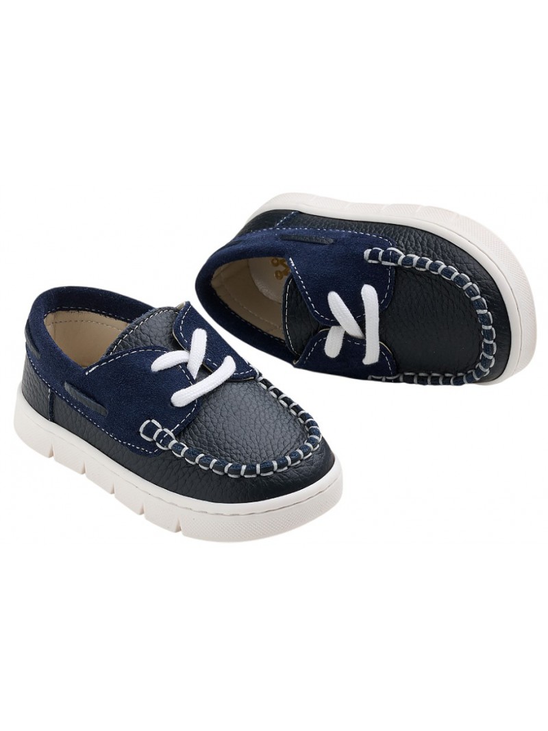 Οικονομικά παπούτσια βάπτισης για αγόρι μοκασίνι από μπλε δέρμα και λευκό καστόρ δέρμα της Everkid σε μοντέρνα γραμμή .