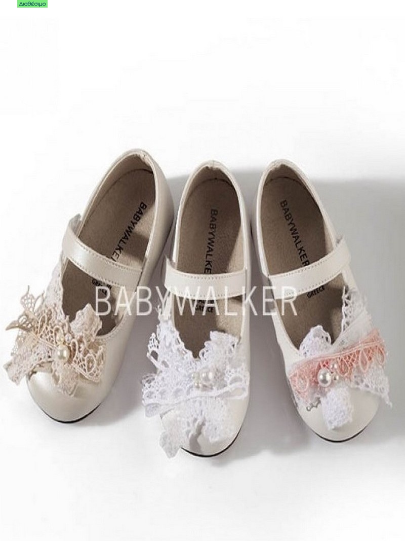 Ιδιαίτερη πρόταση από την Babywalker αυτό το βαπτιστικό γοβάκι από τεχνόδερμα υψηλής ποιότητας διακοσμημένο με περλίτσες και λευκό δαντελένιο φιόγκο.