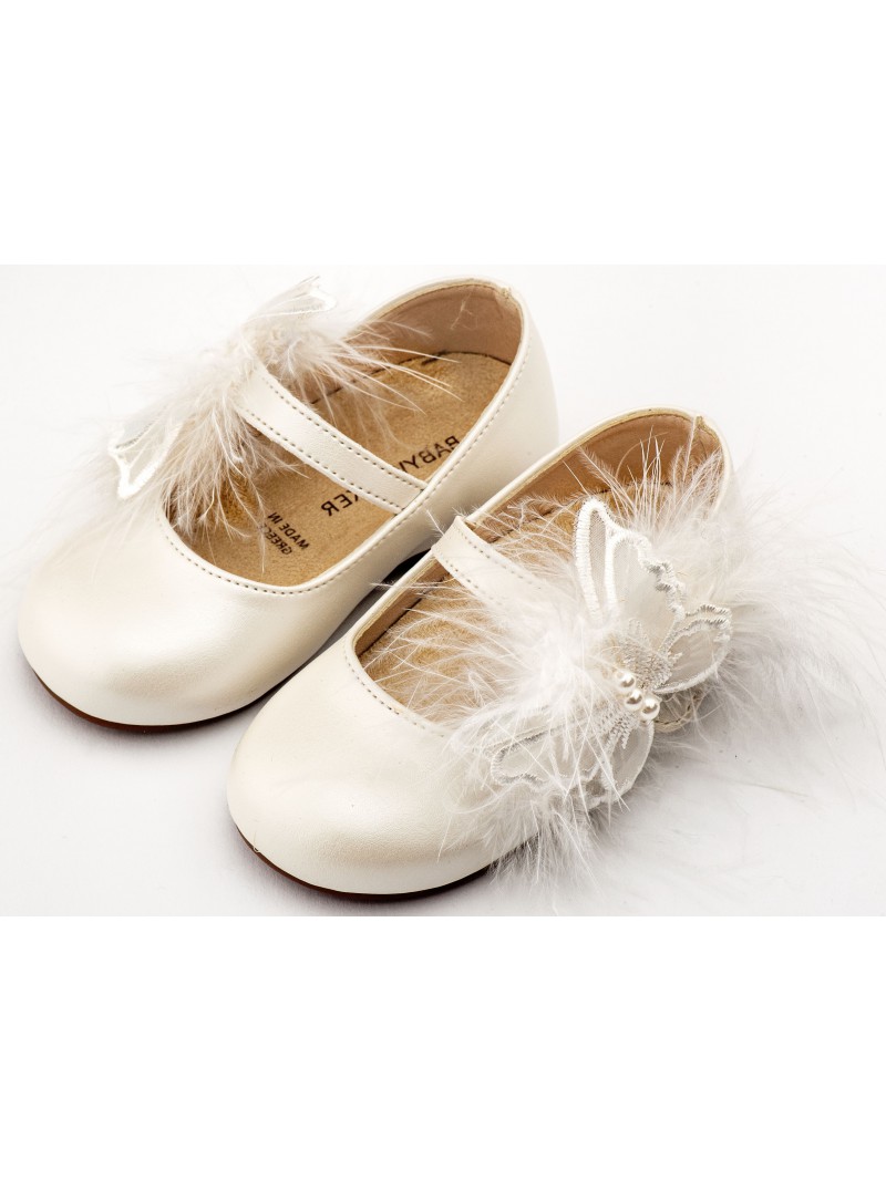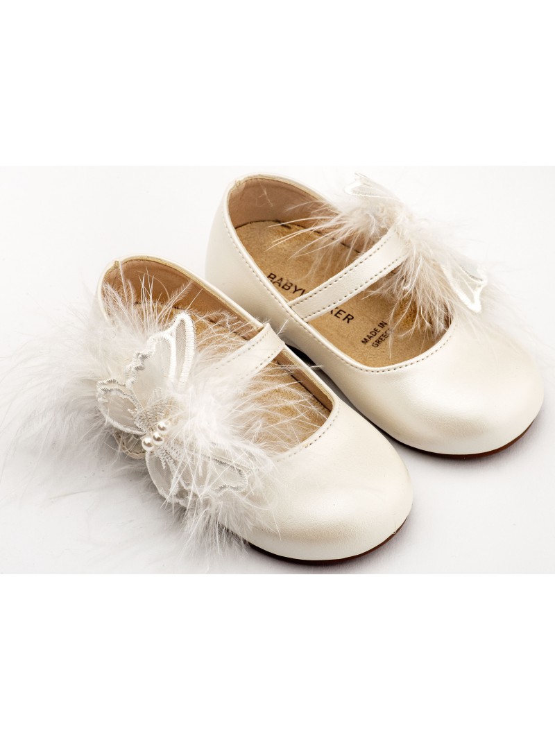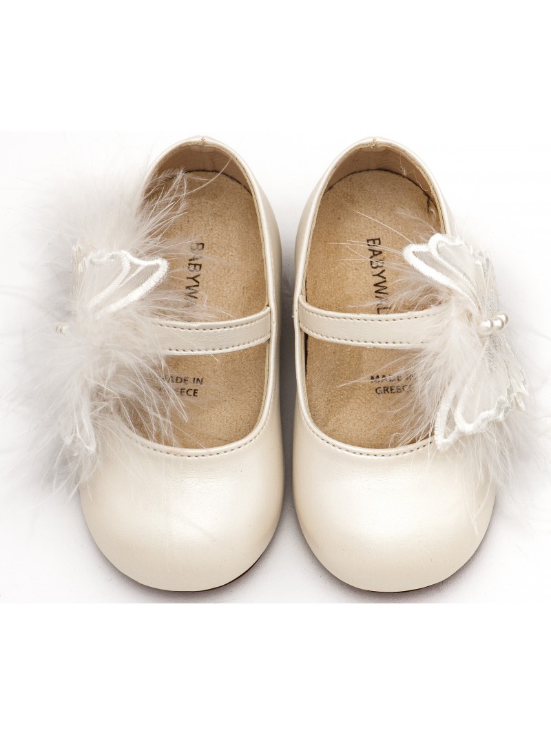 Δερμάτινα παπούτσια βάπτισης για κορίτσι οικονομικά γοβάκια μοντέρνα εκρού της BABYWALKER με μονή μπαρέτα διακοσμημένη με χειροποίητο διακοσμητικό πεταλούδα και πούπουλα .