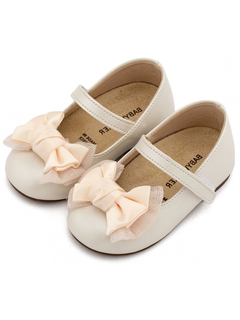 Βαπτιστικά γοβάκια δερμάτινα οικονομικά μοντέρνα εκρού της BABYWALKER με μονή μπαρέτα διακοσμημένη με χειροποίητο satin φιόγκο .