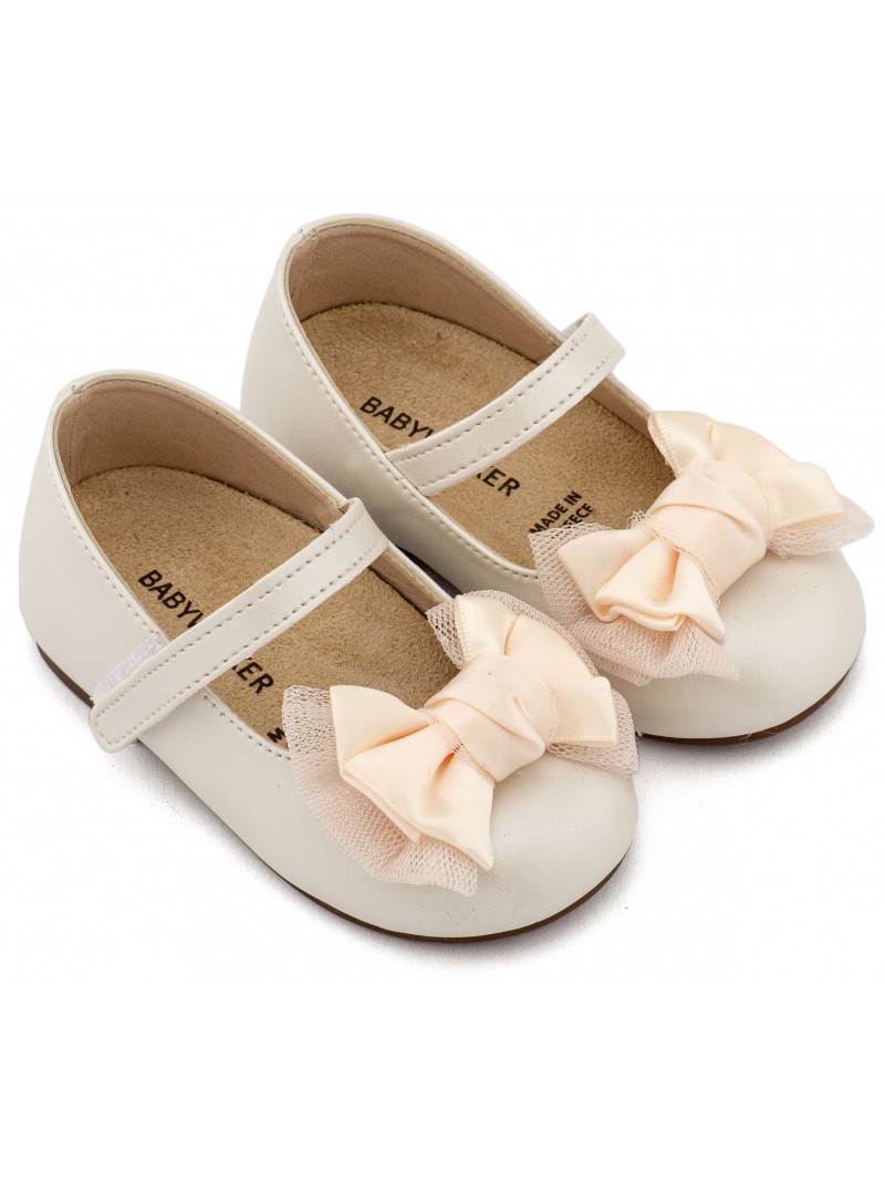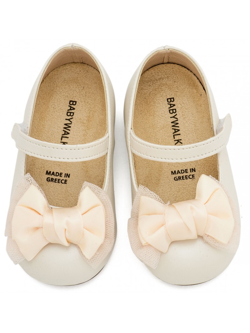 Παπουτσάκια Βάπτισης Κορίτσι Δερμάτινα Γοβάκια Ανατομικά Οικονομικά Babywalker BS 3599 Εκρού Με Φιόγκο
