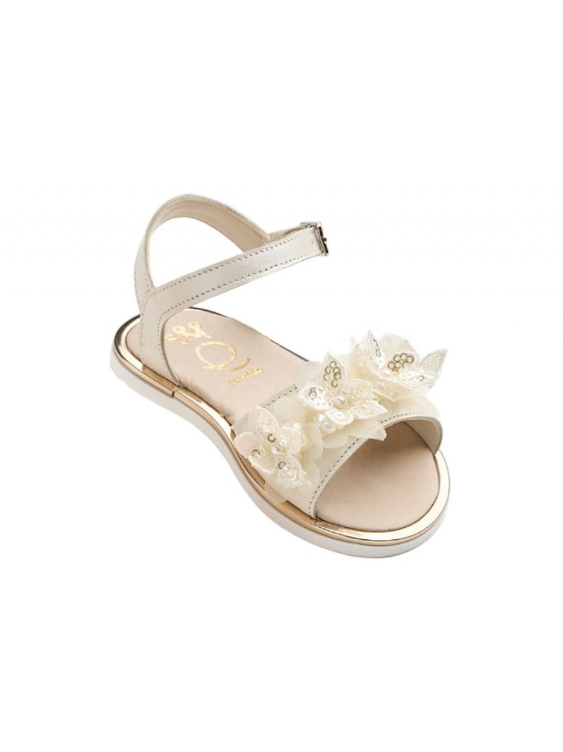 Πεδιλάκια βάπτισης για κορίτσι δερμάτινα εκρού της Everkid διακοσμημένα με εκρού λουλούδια και παγιέτες.