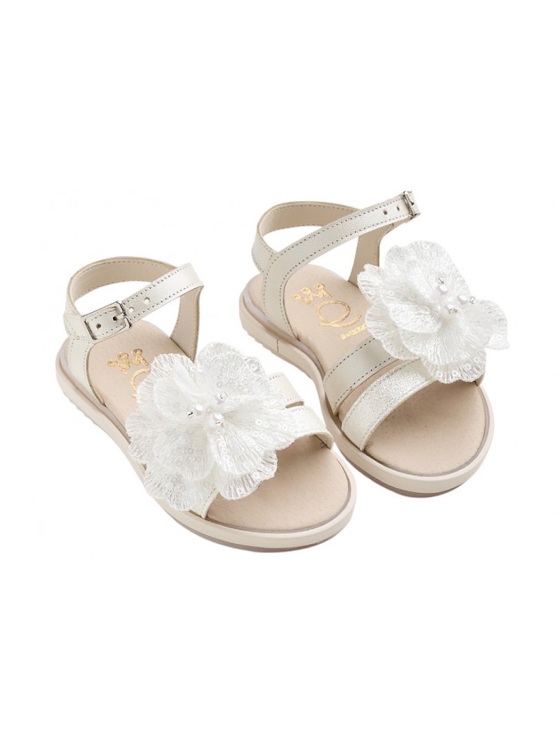 Δερμάτινα πέδιλα βάπτισης για κορίτσι εκρού με λευκό glitter της Everkid διακοσμημένα με κεντημένο λουλούδι και παγιέτες.