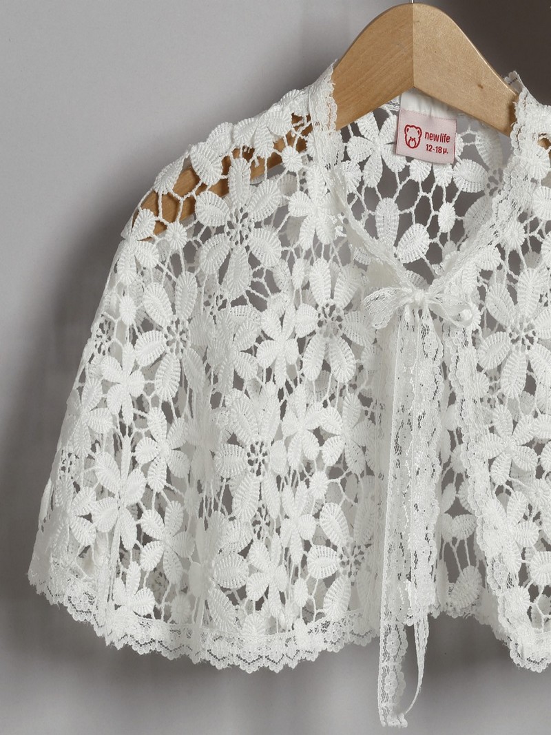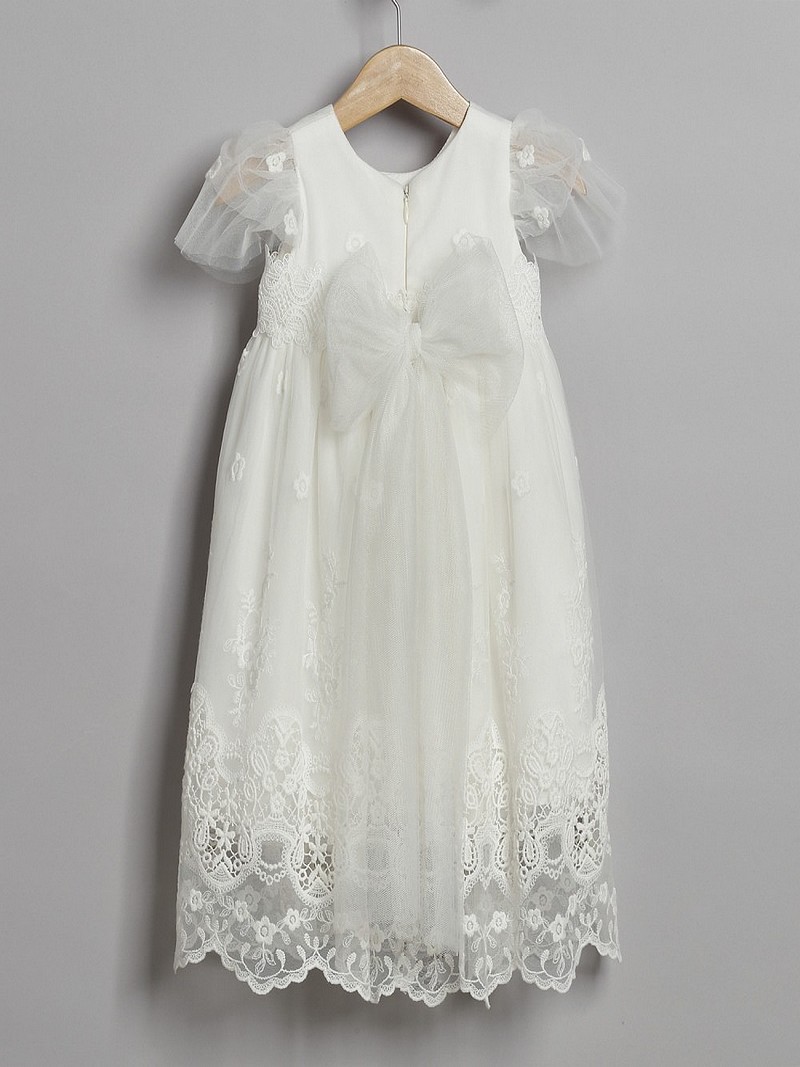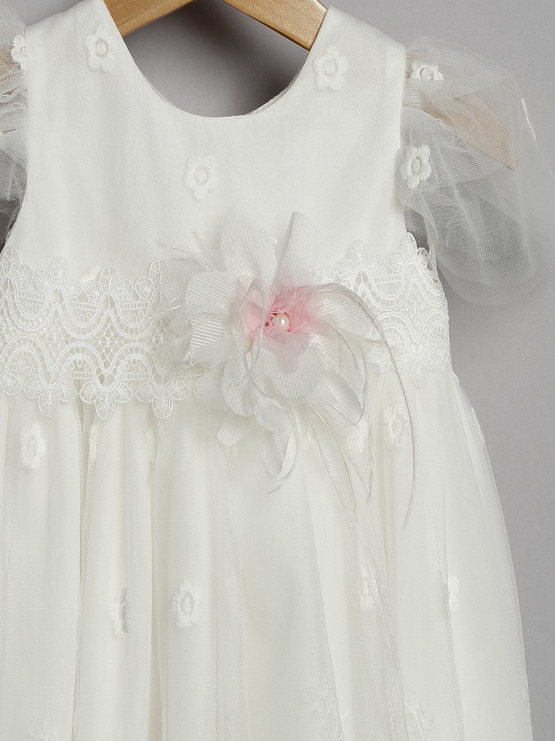 Βαπτιστικό φόρεμα με μπολερό από εκρού τούλινη δαντέλα οικονομικό μοντέρνο της New Life με εσωτερική βαμβακερή φόδρα. Διακοσμείται με ζώνη από εκρού δαντέλα στην οποία είναι ραμμένο λουλούδι από μουσελίνα και τούλι. Στο πίσω μέρος υπάρχει τούλινος φιόγκος. Συνοδεύεται στην ίδια τιμή από εκρού πλεκτό μπολερό και καπελάκι για τα μαλλιά .