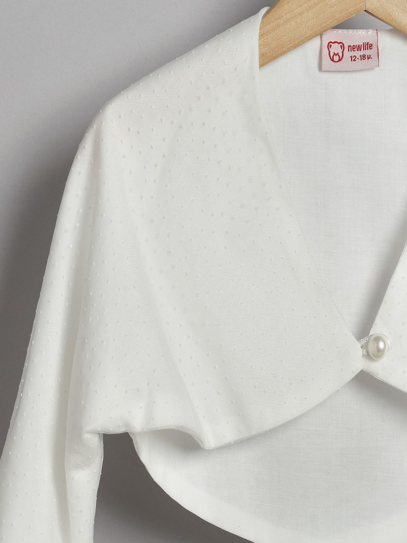 Βαπτιστικό φόρεμα από εκρού πουά τούλι οικονομικό σετ με ζακετάκι ολοκληρωμένο μοντέρνο της New Life με εσωτερική βαμβακερή φόδρα. Διακοσμείται εμπρός με λουλούδι από πλισέ τούλι και πέρλα και τούλινη ζώνη που σχηματίζει φιόγκο στο πίσω μέρος. Συνοδεύεται στην ίδια τιμή από εκρού ζακετάκι και κορδέλα για τα μαλλιά .