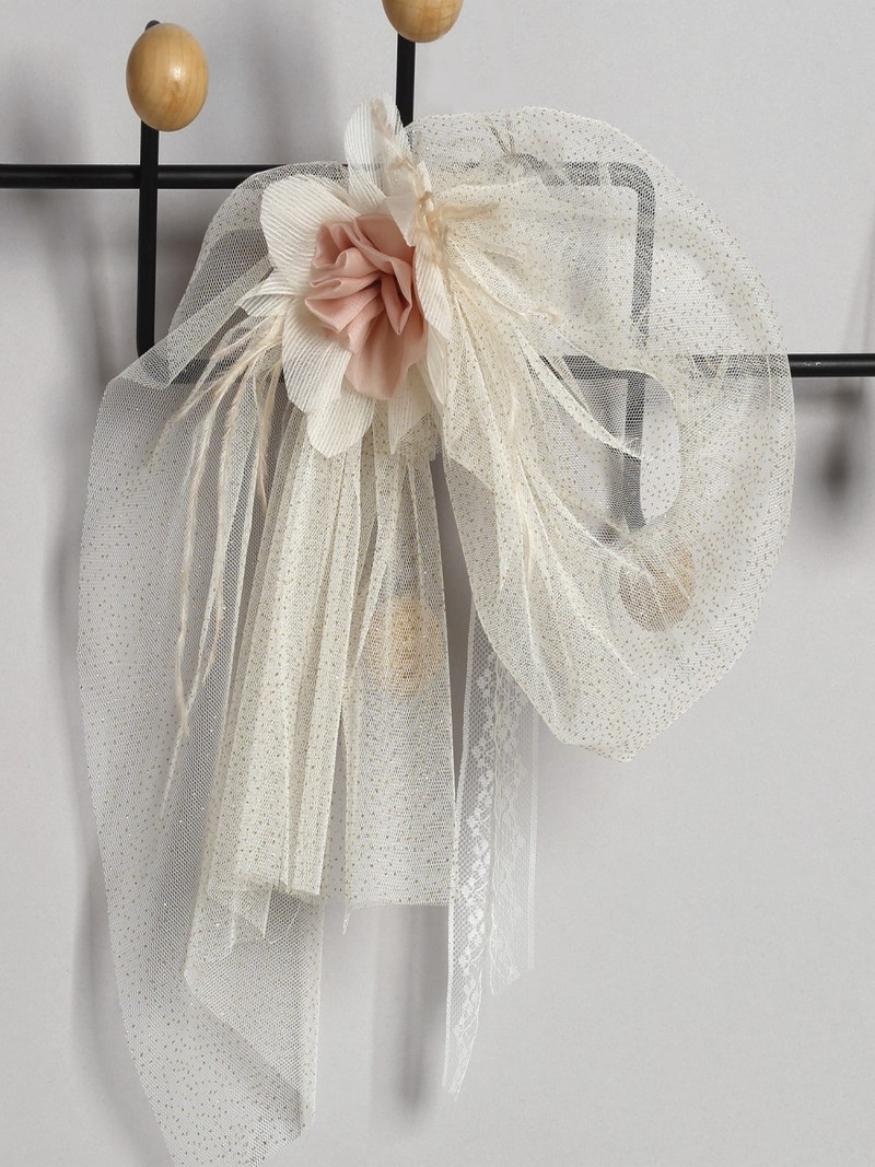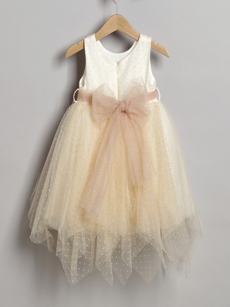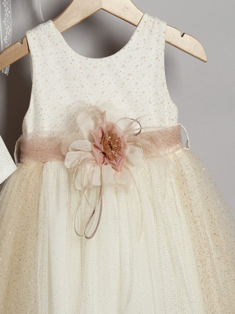 Φόρεμα βάπτισης με ασορτί ζακετάκι από χρυσό τούλι glitter οικονομικό σετ ολοκληρωμένο μοντέρνο της New Life με δεύτερη διπλή εσωτερική φούστα και βαμβακερή φόδρα. Διακοσμείται εμπρός με λουλούδι από τούλι και μουσελίνα και ζώνη από glitter τούλι η οποία σχηματίζει φιόγκο στο πίσω μέρος. Συνοδεύεται στην ίδια τιμή από glitter τούλι ζακετάκι σε χρυσή απόχρωση και ασορτί μπαντάνα για τα μαλλιά .