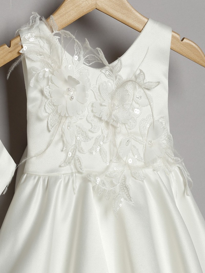 Φόρεμα βάπτισης ασύμμετρο από εκρού satin με μπολερό οικονομικό σετ ολοκληρωμένο μοντέρνο της New Life με εσωτερική βαμβακερή φόδρα. Διακοσμείται εμπρός από σύνθεση λουλουδιών, πούλιες και πούπουλα και άσπρος satin φιόγκος στο πίσω μέρος. Συνοδεύεται στην ίδια τιμή από ζακετάκι σε εκρού απόχρωση και ασορτί κορδέλα για τα μαλλιά .