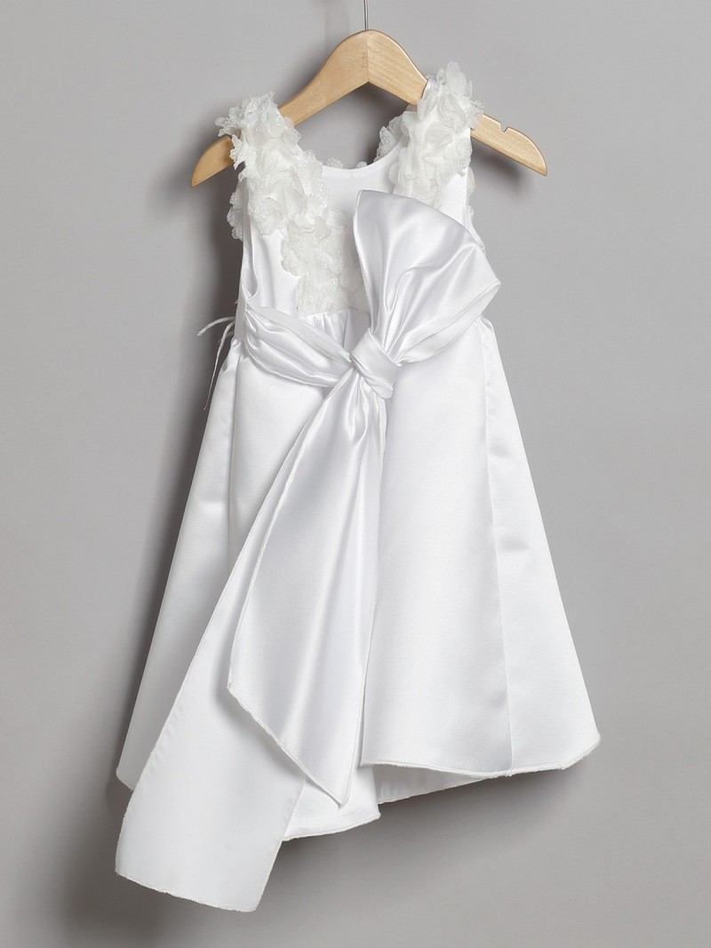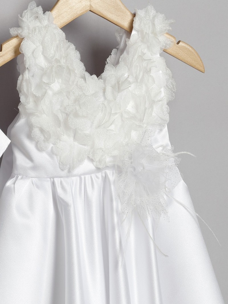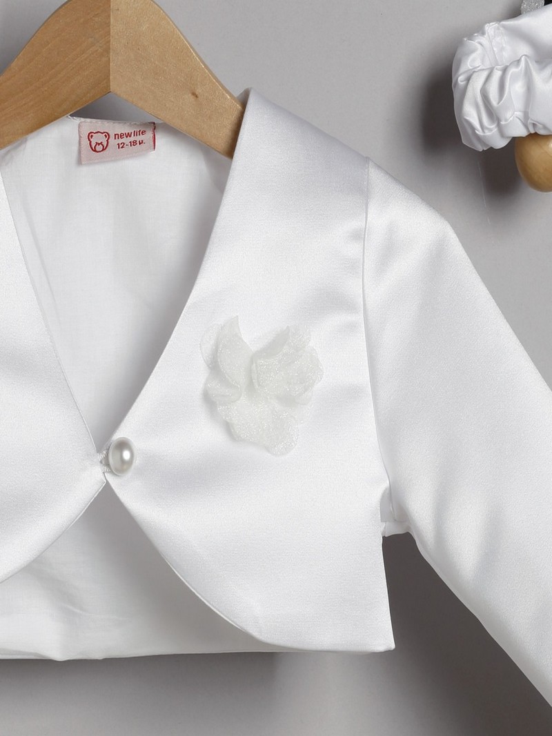 Φόρεμα βάπτισης οικονομικό από λευκό satin με μπολερό ολοκληρωμένο σετ μοντέρνο της New Life με εσωτερική βαμβακερή φόδρα. Διακοσμείται εμπρός από λουλούδια ραμμένα στον μπούστο και satin φιόγκο στο πίσω μέρος. Συνοδεύεται στην ίδια τιμή από ζακετάκι satin σε λευκή απόχρωση και ασορτί κορδέλα για τα μαλλιά .