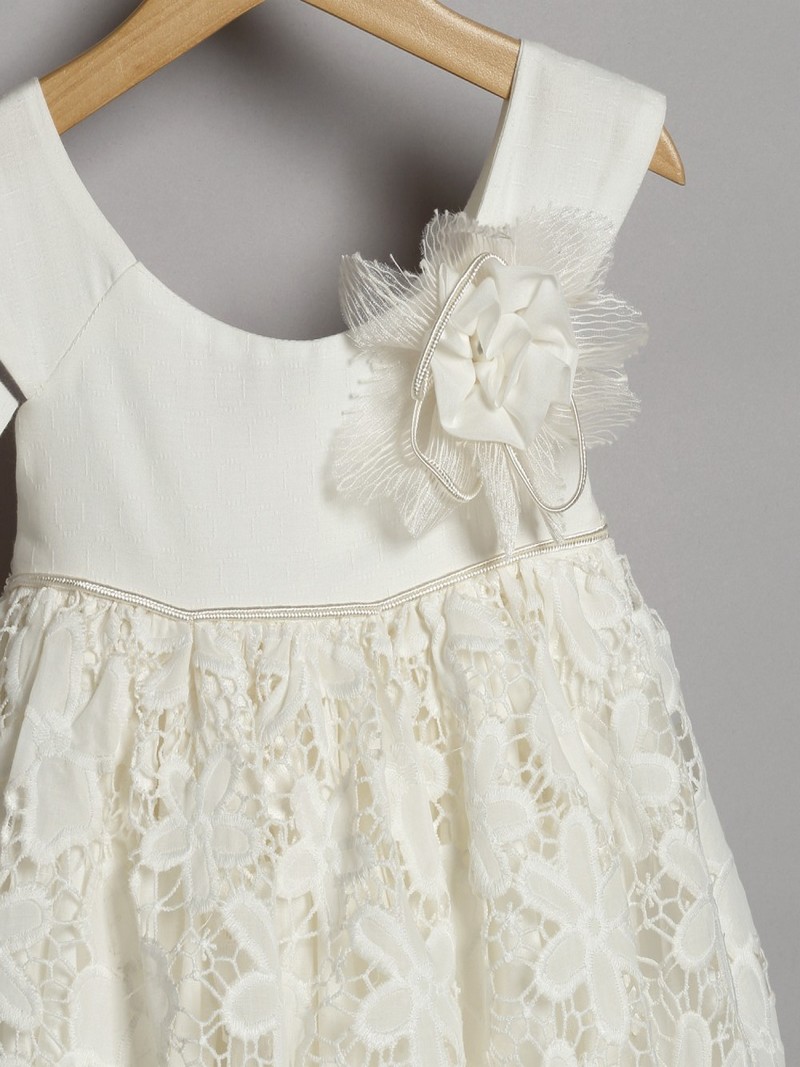 Φόρεμα βάπτισης μοντέρνο από εκρού πλεκτή δαντέλα με μπολερό ολοκληρωμένο σετ μοντέρνο της New Life με δεύτερη εσωτερική φούστα και βαμβακερή φόδρα. Διακοσμείται εμπρός από λουλούδι δαντέλας και μουσελίνας και φιόγκο από βαμβακερή ποπλίνα στο πίσω μέρος. Συνοδεύεται στην ίδια τιμή από εκρού ζακετάκι και ασορτί κορδέλα για τα μαλλιά .
