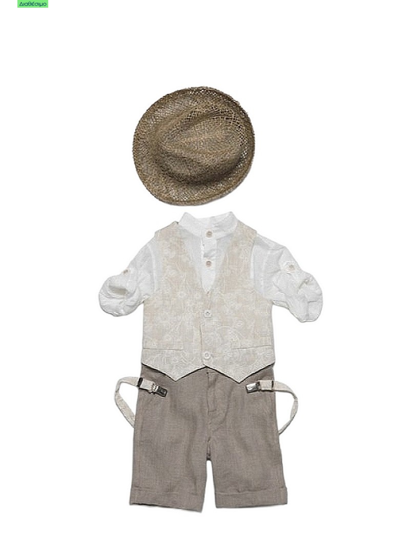 Βαπτιστικό κουστουμάκι της Guy Laroche σε γήινες-απαλές αποχρώσεις, αποτελούμενο από λινή μονόχρωμη βερμούδα, πουκάμισο με γιακά μάο, λινό γιλέκο διακοσμημένο με λουλούδια και ασορτί τιράντες. Το σετ ολοκληρώνεται από ψάθινο καπελάκι στην ίδια τιμή .Το κουστουμάκι βάπτισης Guy Laroche περιλαμβάνει: