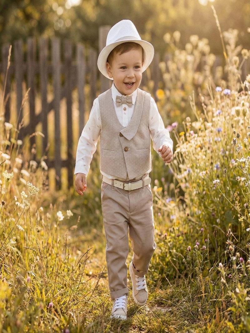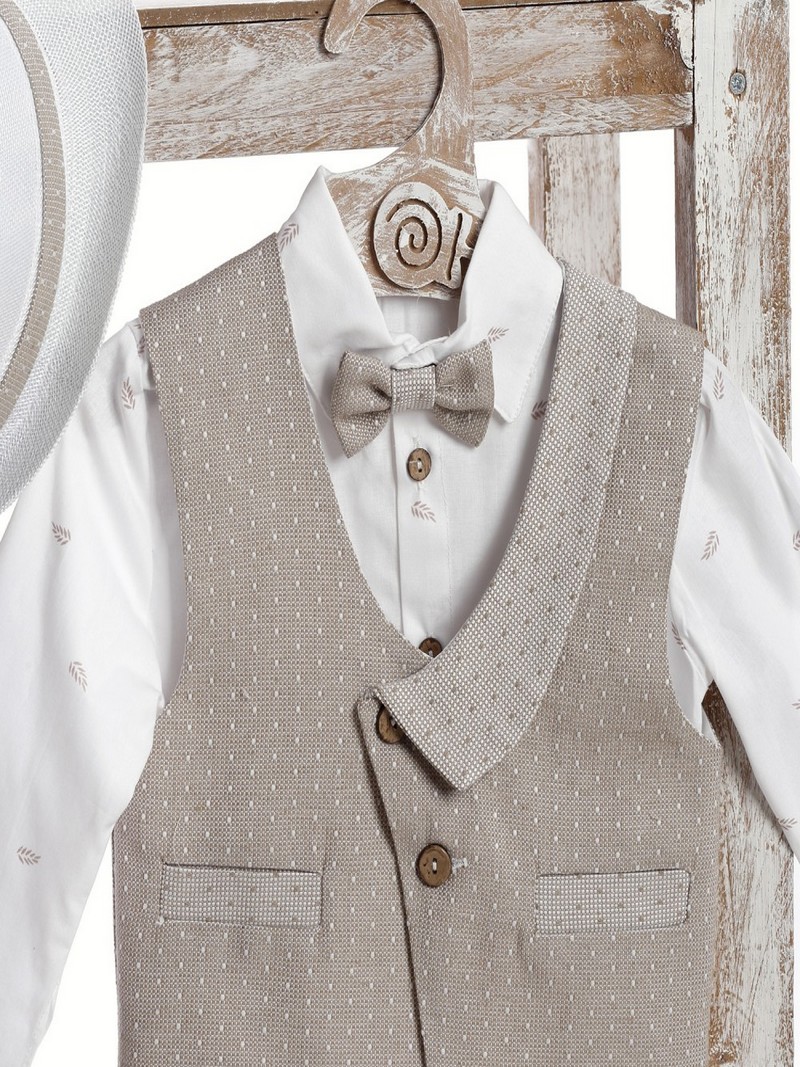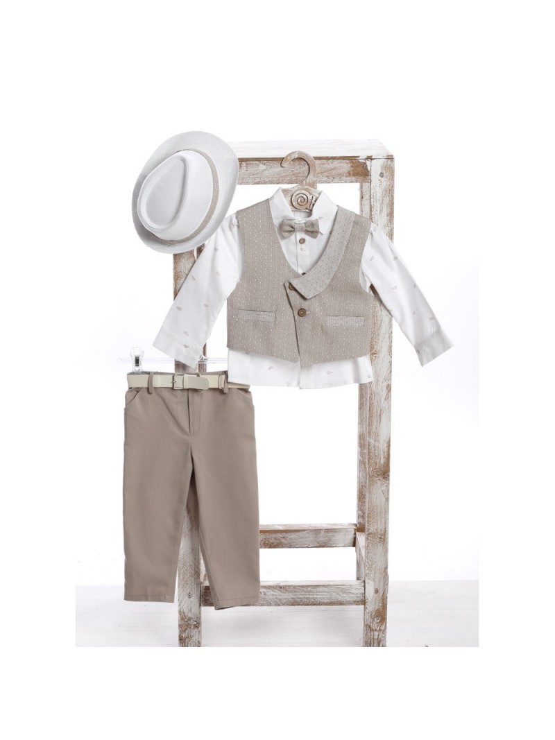Βαπτιστικό κουστουμάκι σε λευκές/μπεζ αποχρώσεις βαμβακερό 100% της Lollipop ολοκληρωμένο σετ μοντέρνο αποτελούμενο από μπεζ παντελόνι με ζώνη, λευκό πουκάμισο με μικροσχέδια, γιλέκο, παπιγιόν και ψάθινο καπελάκι στυλ καβουράκι.Το βαπτιστικό κουστουμάκι Lollipop περιλαμβάνει: