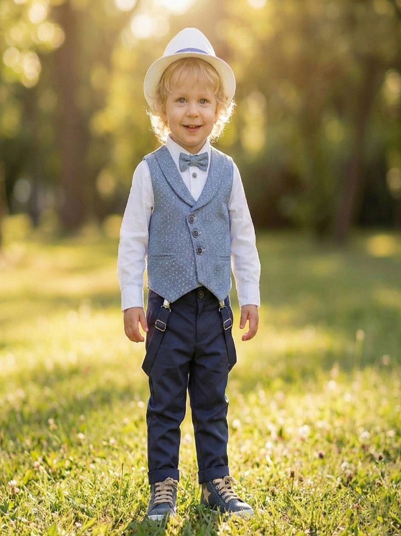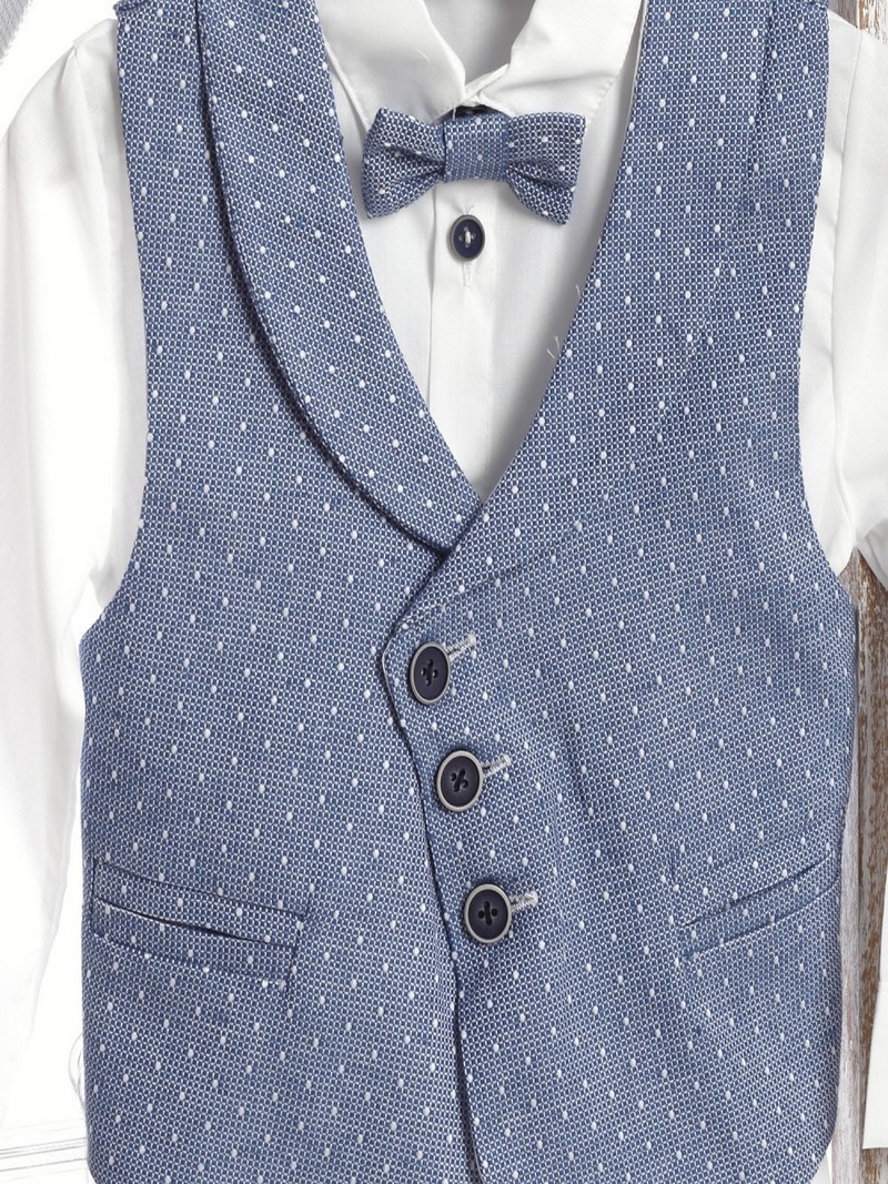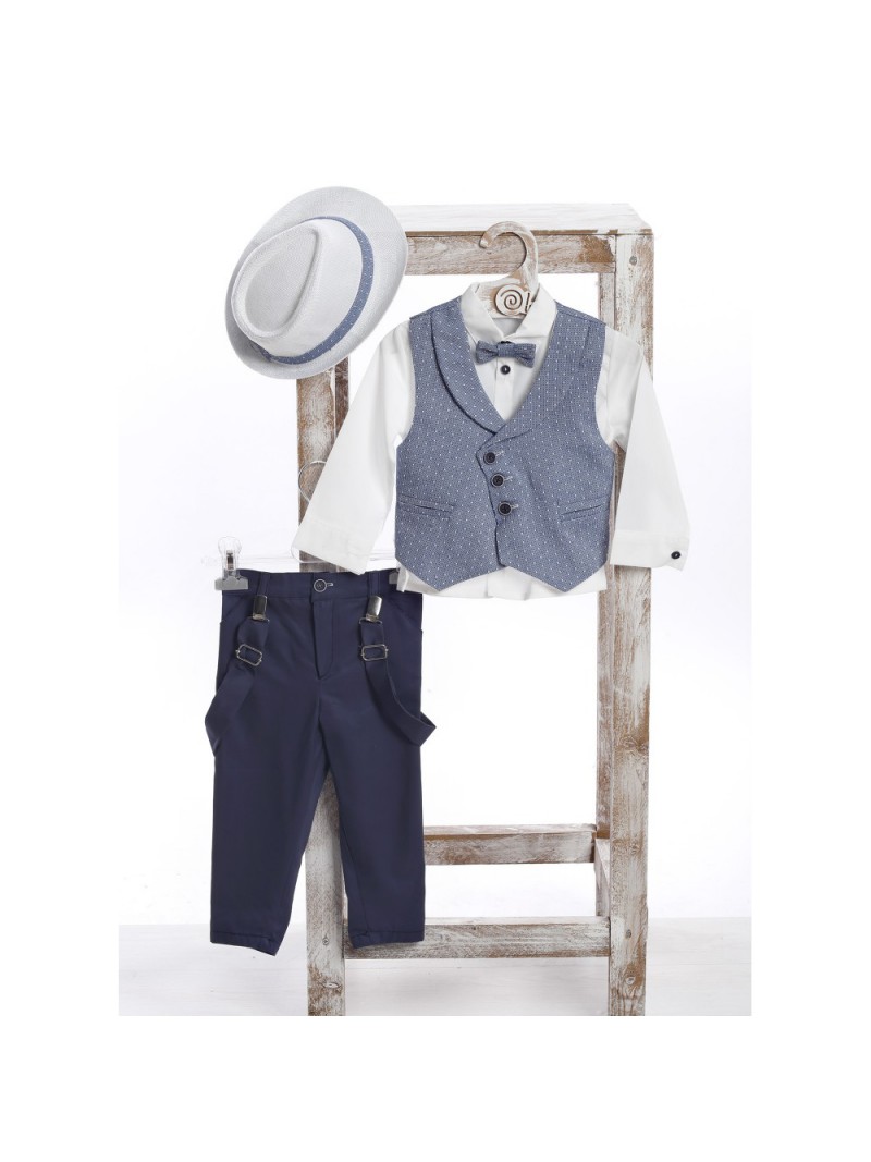 Βαπτιστικό κουστουμάκι σε λευκές/μπλε αποχρώσεις βαμβακερό 100% της Lollipop ολοκληρωμένο σετ μοντέρνο αποτελούμενο από μπλε παντελόνι με ασορτί τιράντες, λευκό μονόχρωμο πουκάμισο, γαλάζιο γιλέκο, παπιγιόν και ψάθινο καπελάκι στυλ καβουράκι.Το βαπτιστικό κουστουμάκι Lollipop περιλαμβάνει: